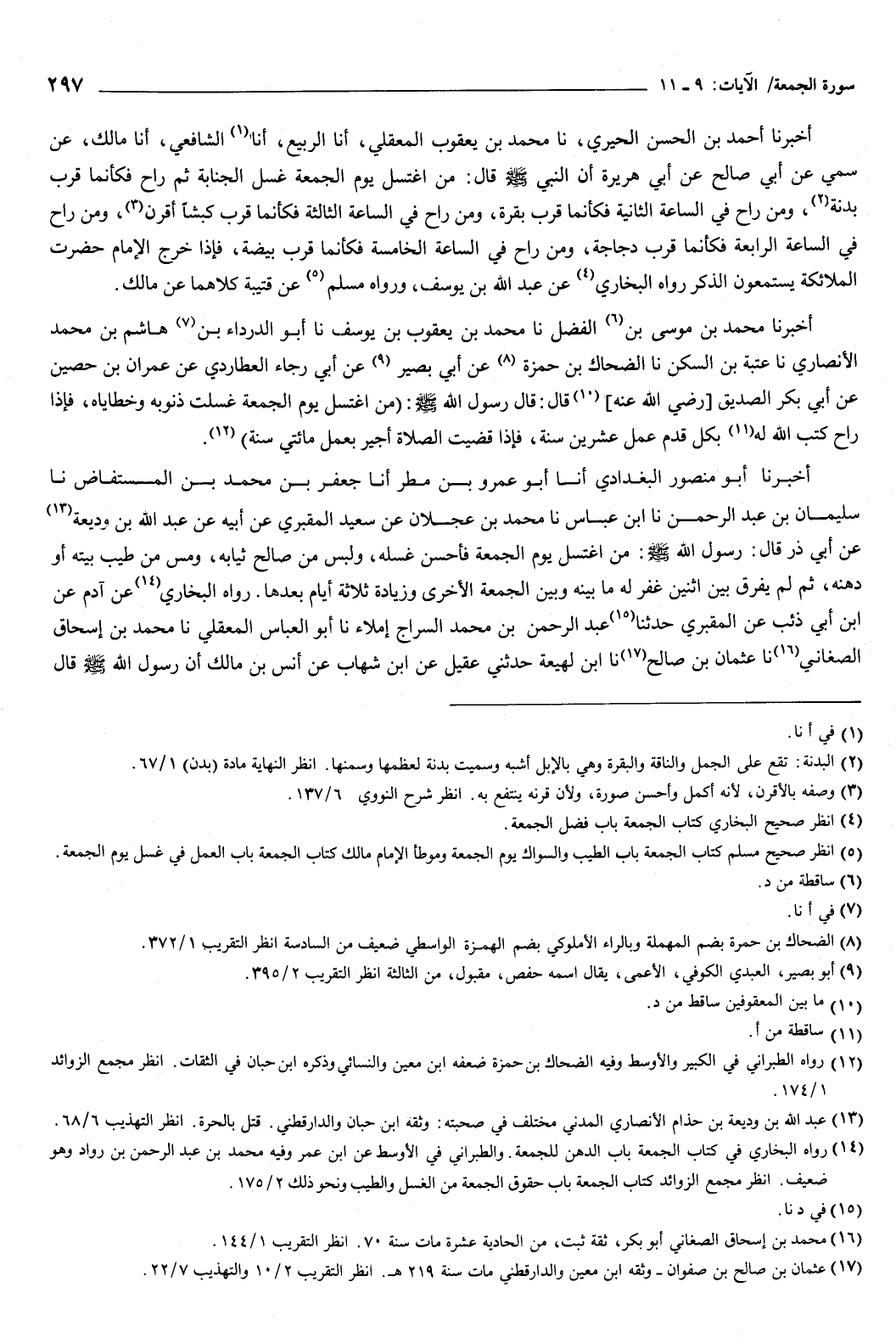 1194 - أَخْبَرَنَا أَبُو مَنْصُورٍ الْبَغْدَادِيُّ، أنا أَبُو عَمْرِو بْنُ مَطَرٍ، أنا جَعْفَرُ بْنُ مُحَمَّدِ بْنِ الْمُسْتَفَاضِ، نا سُلَيْمَانُ بْنُ عَبْدِ الرَّحْمَنِ، نا ابْنُ عَبَّاسٍ، ونا مُحَمَّدُ بْنُ عَجْلانَ، عَنْ سَعِيدٍ الْمَقْبُرِيِّ، عَنْ أَبِيهِ، عَنْ عَبْدِ اللَّهِ بْنِ وَدِيعَةَ، عَنْ أَبِي ذَرٍّ، قَالَ رَسُولُ اللَّهِ صَلَّى اللهُ عَلَيْهِ وَسَلَّمَ: «مَنِ اغْتَسَلَ يَوْمَ الْجُمُعَةِ فَأَحْسَنَ غُسْلَهُ، وَلَبِسَ مِنْ صَالِحِ ثِيَابِهِ، وَمَسَّ مِنْ طِيبِ بَيْتِهِ أَوْ دُهْنِهِ، ثُمَّ لَمْ يُفَرِّقْ بَيْنَ اثْنَيْنِ غُفِرَ لَهُ مَا بَيْنَهُ وَبَيْنَ الْجُمُعَةِ الأُخْرَى، وَزِيَادَةُ ثَلاثَةِ أَيَّامٍ بَعْدَهَا» رَوَاهُ الْبُخَارِيُّ، عَنْ آدَمَ، عَنِ ابْنِ أَبِي ذِئْبٍ، عَنِ الْمَقْبُرِيِّ.