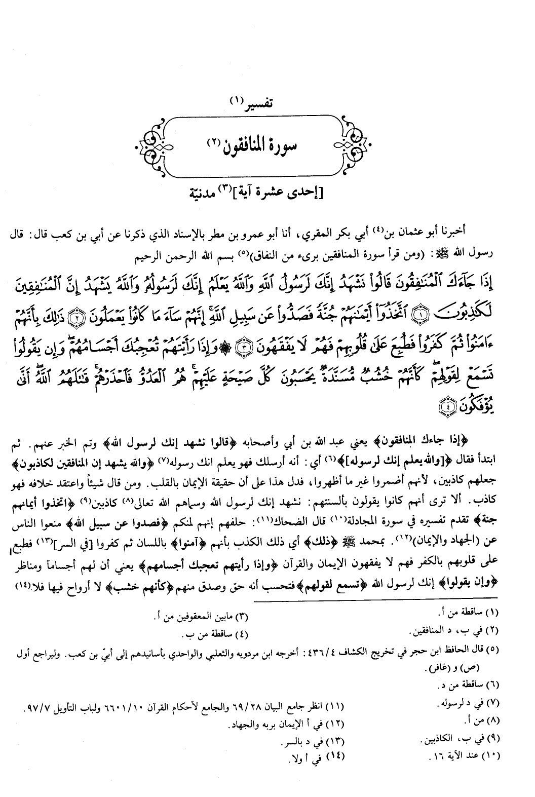 بسم الله الرحمن الرحيم {إِذَا جَاءَكَ الْمُنَافِقُونَ قَالُوا نَشْهَدُ إِنَّكَ لَرَسُولُ اللَّهِ وَاللَّهُ يَعْلَمُ إِنَّكَ لَرَسُولُهُ وَاللَّهُ يَشْهَدُ إِنَّ الْمُنَافِقِينَ لَكَاذِبُونَ {1} اتَّخَذُوا أَيْمَانَهُمْ جُنَّةً فَصَدُّوا عَنْ سَبِيلِ اللَّهِ إِنَّهُمْ سَاءَ مَا كَانُوا يَعْمَلُونَ {2} ذَلِكَ بِأَنَّهُمْ آمَنُوا ثُمَّ كَفَرُوا فَطُبِعَ عَلَى قُلُوبِهِمْ فَهُمْ لا يَفْقَهُونَ {3} وَإِذَا رَأَيْتَهُمْ تُعْجِبُكَ أَجْسَامُهُمْ وَإِنْ يَقُولُوا تَسْمَعْ لِقَوْلِهِمْ كَأَنَّهُمْ خُشُبٌ مُسَنَّدَةٌ يَحْسَبُونَ كُلَّ صَيْحَةٍ عَلَيْهِمْ هُمُ الْعَدُوُّ فَاحْذَرْهُمْ قَاتَلَهُمُ اللَّهُ أَنَّى يُؤْفَكُونَ {4} } [المنافقون: 1-4] .
