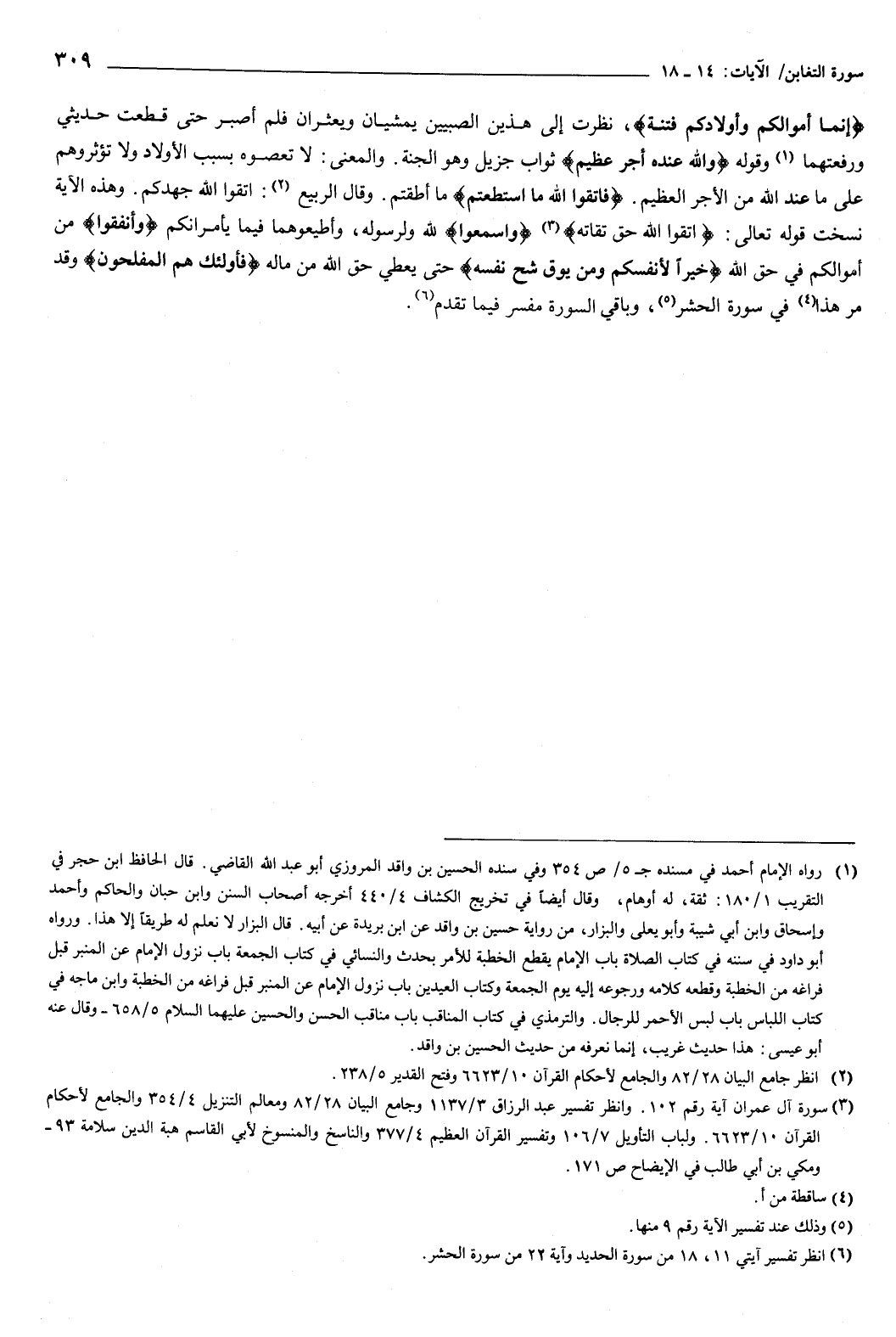 {إِنَّمَا أَمْوَالُكُمْ وَأَوْلادُكُمْ فِتْنَةٌ} [التغابن: 15] نَظَرْتُ إِلَى هَذَيْنِ الصَّبِيَّيْنِ يَمْشِيَانِ وَيَعْثُرَانِ، فَلَمْ أَصْبِرْ حَتَّى قَطَعْتُ حَدِيثِي وَرَفَعْتُهُمَا