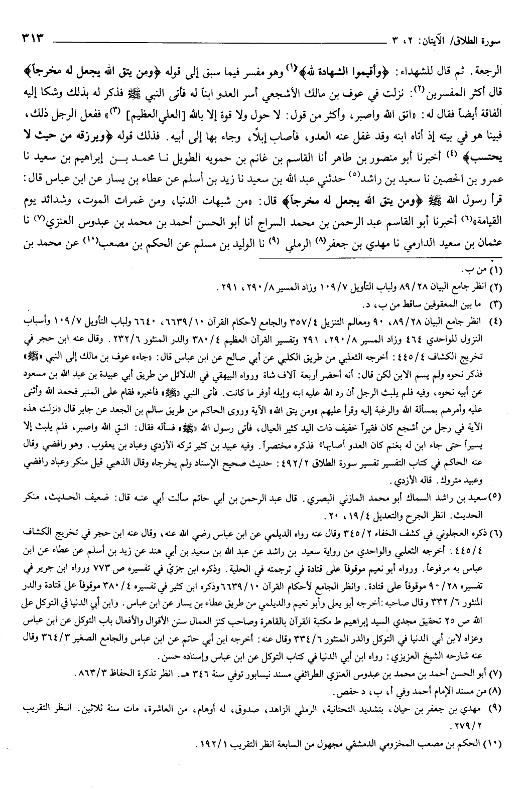 ثم قال للشهداء: {وَأَقِيمُوا الشَّهَادَةَ لِلَّهِ} [الطلاق: 2] وهو مفسر فيما سبق، إلى قوله: {وَمَنْ يَتَّقِ اللَّهَ يَجْعَلْ لَهُ مَخْرَجًا} [الطلاق: 2] قال أكثر المفسرين: نزلت في عوف بن مالك الأشجعي، أسر العدو ابنًا له، فأتى النبي صَلَّى اللهُ عَلَيْهِ وَسَلَّمَ، فذكر له بذلك، وشكا إليه الفاقة أيضًا، فقال له: " اتق الله واصبر، وأكثر من قول: لا حول ولا قوة إلا بالله العلي العظيم ".