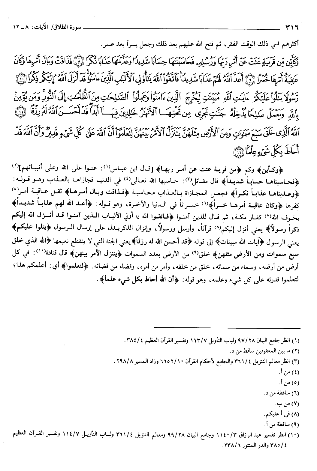 {وَكَأَيِّنْ مِنْ قَرْيَةٍ عَتَتْ عَنْ أَمْرِ رَبِّهَا وَرُسُلِهِ فَحَاسَبْنَاهَا حِسَابًا شَدِيدًا وَعَذَّبْنَاهَا عَذَابًا نُكْرًا {8} فَذَاقَتْ وَبَالَ أَمْرِهَا وَكَانَ عَاقِبَةُ أَمْرِهَا خُسْرًا {9} أَعَدَّ اللَّهُ لَهُمْ عَذَابًا شَدِيدًا فَاتَّقُوا اللَّهَ يَا أُولِي الأَلْبَابِ الَّذِينَ آمَنُوا قَدْ أَنْزَلَ اللَّهُ إِلَيْكُمْ ذِكْرًا {10} رَسُولا يَتْلُو عَلَيْكُمْ آيَاتِ اللَّهِ مُبَيِّنَاتٍ لِيُخْرِجَ الَّذِينَ آمَنُوا وَعَمِلُوا الصَّالِحَاتِ مِنَ الظُّلُمَاتِ إِلَى النُّورِ وَمَنْ يُؤْمِنْ بِاللَّهِ وَيَعْمَلْ صَالِحًا يُدْخِلْهُ جَنَّاتٍ تَجْرِي مِنْ تَحْتِهَا الأَنْهَارُ خَالِدِينَ فِيهَا أَبَدًا قَدْ أَحْسَنَ اللَّهُ لَهُ رِزْقًا {11} اللَّهُ الَّذِي خَلَقَ سَبْعَ سَمَوَاتٍ وَمِنَ الأَرْضِ مِثْلَهُنَّ يَتَنَزَّلُ الأَمْرُ بَيْنَهُنَّ لِتَعْلَمُوا أَنَّ اللَّهَ عَلَى كُلِّ شَيْءٍ قَدِيرٌ وَأَنَّ اللَّهَ قَدْ أَحَاطَ بِكُلِّ شَيْءٍ عِلْمًا {12} } [الطلاق: 8-12] .
