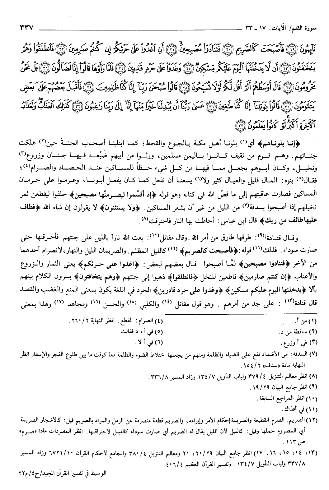 نَائِمُونَ {19} فَأَصْبَحَتْ كَالصَّرِيمِ {20} فَتَنَادَوْا مُصْبِحِينَ {21} أَنِ اغْدُوا عَلَى حَرْثِكُمْ إِنْ كُنْتُمْ صَارِمِينَ {22} فَانْطَلَقُوا وَهُمْ يَتَخَافَتُونَ {23} أَنْ لا يَدْخُلَنَّهَا الْيَوْمَ عَلَيْكُمْ مِسْكِينٌ {24} وَغَدَوْا عَلَى حَرْدٍ قَادِرِينَ {25} فَلَمَّا رَأَوْهَا قَالُوا إِنَّا لَضَالُّونَ {26} بَلْ نَحْنُ مَحْرُومُونَ {27} قَالَ أَوْسَطُهُمْ أَلَمْ أَقُلْ لَكُمْ لَوْلا تُسَبِّحُونَ {28} قَالُوا سُبْحَانَ رَبِّنَا إِنَّا كُنَّا ظَالِمِينَ {29} فَأَقْبَلَ بَعْضُهُمْ عَلَى بَعْضٍ يَتَلاوَمُونَ {30} قَالُوا يَا وَيْلَنَا إِنَّا كُنَّا طَاغِينَ {31} عَسَى رَبُّنَا أَنْ يُبْدِلَنَا خَيْرًا مِنْهَا إِنَّا إِلَى رَبِّنَا رَاغِبُونَ {32} كَذَلِكَ الْعَذَابُ وَلَعَذَابُ الآخِرَةِ أَكْبَرُ لَوْ كَانُوا يَعْلَمُونَ {33} } [القلم: 17-33] .