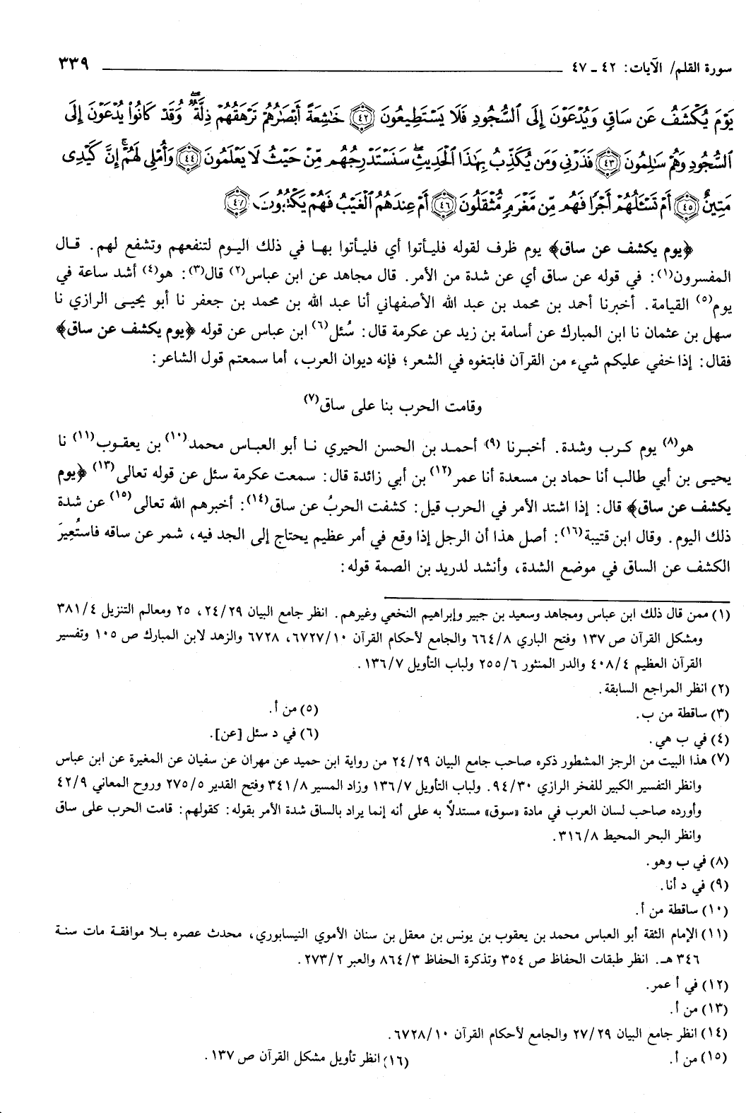 أخبرنا أحمد بن الحسن الحيري، نا أبو العباس محمد بن يعقوب، نا يحيى بن أبي طالب، أنا حماد بن مسعدة، أنا عمر بن أبي زائدة، قال: سمعت عكرمة سئل عن قوله تعالى: {يَوْمَ يُكْشَفُ عَنْ سَاقٍ} [القلم: 42] قال: إذا اشتد الأمر في الحرب، قيل: كشفت الحرب عن ساق.