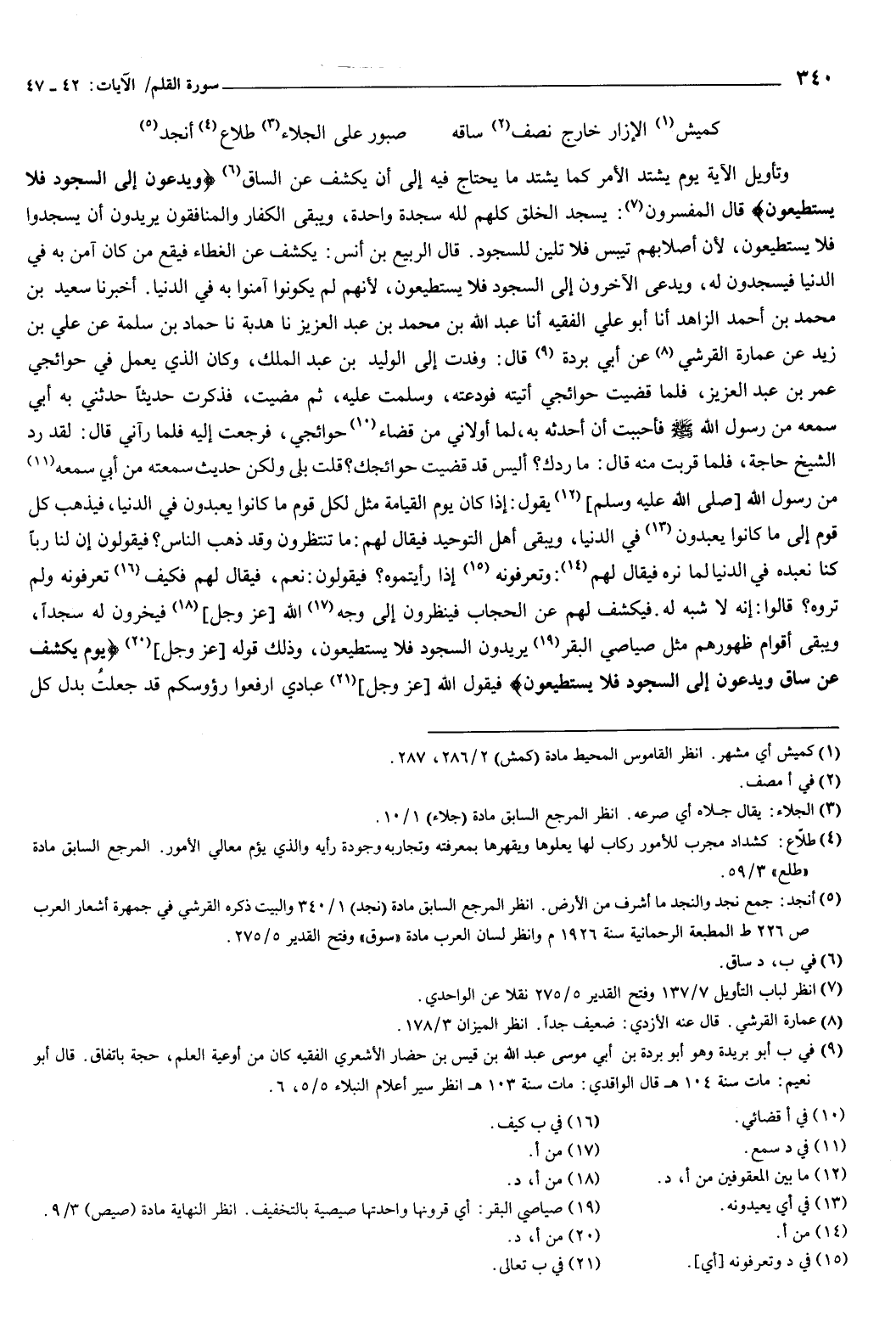 وتأويل الآية: يوم يشتد الأمر، كما يشتد ما يحتاج فيه إلى أن يكشف عن الساق، {وَيُدْعَوْنَ إِلَى السُّجُودِ فَلا يَسْتَطِيعُونَ} [القلم: 42] قال المفسرون: يسجد الخلق كلهم لله سجدة واحدة، ويبقى الكفار والمنافقون، يريدون أن يسجدوا فلا يستطيعون، لأن أصلابهم تيبس فلا تلين للسجود.
