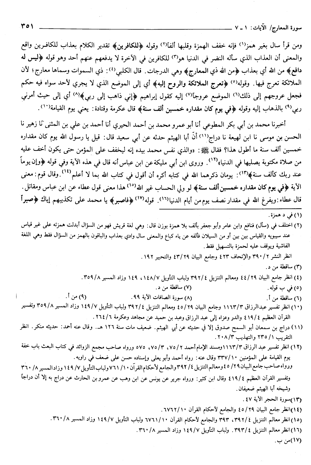 وقوله: {تَعْرُجُ الْمَلائِكَةُ وَالرُّوحُ إِلَيْهِ} [المعارج: 4] أي: إلى الموضع الذي لا يجري لأحد سواه فيه حكم، فجعل عروجهم إلى ذلك الموضع عروجًا إليه، كقول إبراهيم: {إِنِّي ذَاهِبٌ إِلَى رَبِّي} [الصافات: 99] أي: إلى حيث أمرني ربي بالذهاب إليه، وقوله: {فِي يَوْمٍ كَانَ مِقْدَارُهُ خَمْسِينَ أَلْفَ سَنَةٍ} [المعارج: 4] قال عكرمة، وقتادة: يعني يوم القيامة.