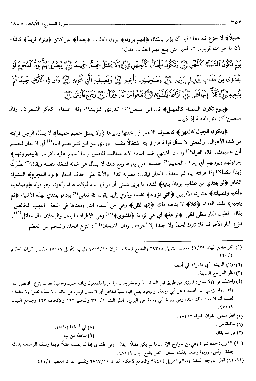 ثم أخبر متى يقع بهم العذاب، فقال: {يَوْمَ تَكُونُ السَّمَاءُ كَالْمُهْلِ {8} وَتَكُونُ الْجِبَالُ كَالْعِهْنِ {9} وَلا يَسْأَلُ حَمِيمٌ حَمِيمًا {10} يُبَصَّرُونَهُمْ يَوَدُّ الْمُجْرِمُ لَوْ يَفْتَدِي مِنْ عَذَابِ يَوْمِئِذٍ بِبَنِيهِ {11} وَصَاحِبَتِهِ وَأَخِيهِ {12} وَفَصِيلَتِهِ الَّتِي تُئْوِيهِ {13} وَمَنْ فِي الأَرْضِ جَمِيعًا ثُمَّ يُنْجِيهِ {14} كَلَّا إِنَّهَا لَظَى {15} نَزَّاعَةً لِلشَّوَى {16} تَدْعُو مَنْ أَدْبَرَ وَتَوَلَّى {17} وَجَمَعَ فَأَوْعَى {18} } [المعارج: 8-18] .