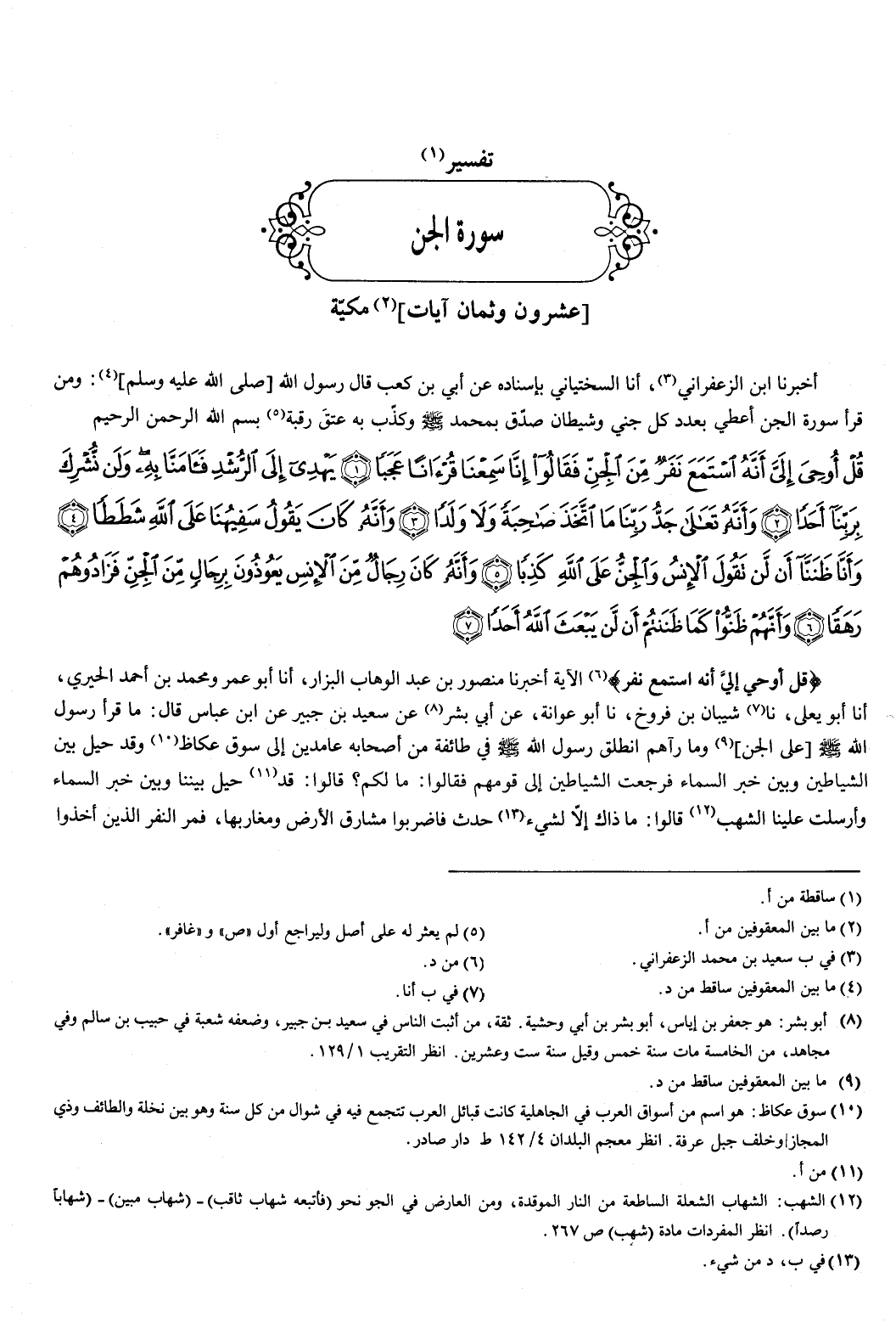 بسم الله الرحمن الرحيم {قُلْ أُوحِيَ إِلَيَّ أَنَّهُ اسْتَمَعَ نَفَرٌ مِنَ الْجِنِّ فَقَالُوا إِنَّا سَمِعْنَا قُرْءَانًا عَجَبًا {1} يَهْدِي إِلَى الرُّشْدِ فَآمَنَّا بِهِ وَلَنْ نُشْرِكَ بِرَبِّنَا أَحَدًا {2} وَأَنَّهُ تَعَالَى جَدُّ رَبِّنَا مَا اتَّخَذَ صَاحِبَةً وَلا وَلَدًا {3} وَأَنَّهُ كَانَ يَقُولُ سَفِيهُنَا عَلَى اللَّهِ شَطَطًا {4} وَأَنَّا ظَنَنَّا أَنْ لَنْ تَقُولَ الإِنْسُ وَالْجِنُّ عَلَى اللَّهِ كَذِبًا {5} وَأَنَّهُ كَانَ رِجَالٌ مِنَ الإِنْسِ يَعُوذُونَ بِرِجَالٍ مِنَ الْجِنِّ فَزَادُوهُمْ رَهَقًا {6} وَأَنَّهُمْ ظَنُّوا كَمَا ظَنَنْتُمْ أَنْ لَنْ يَبْعَثَ اللَّهُ أَحَدًا {7} } [الجن: 1-7] .