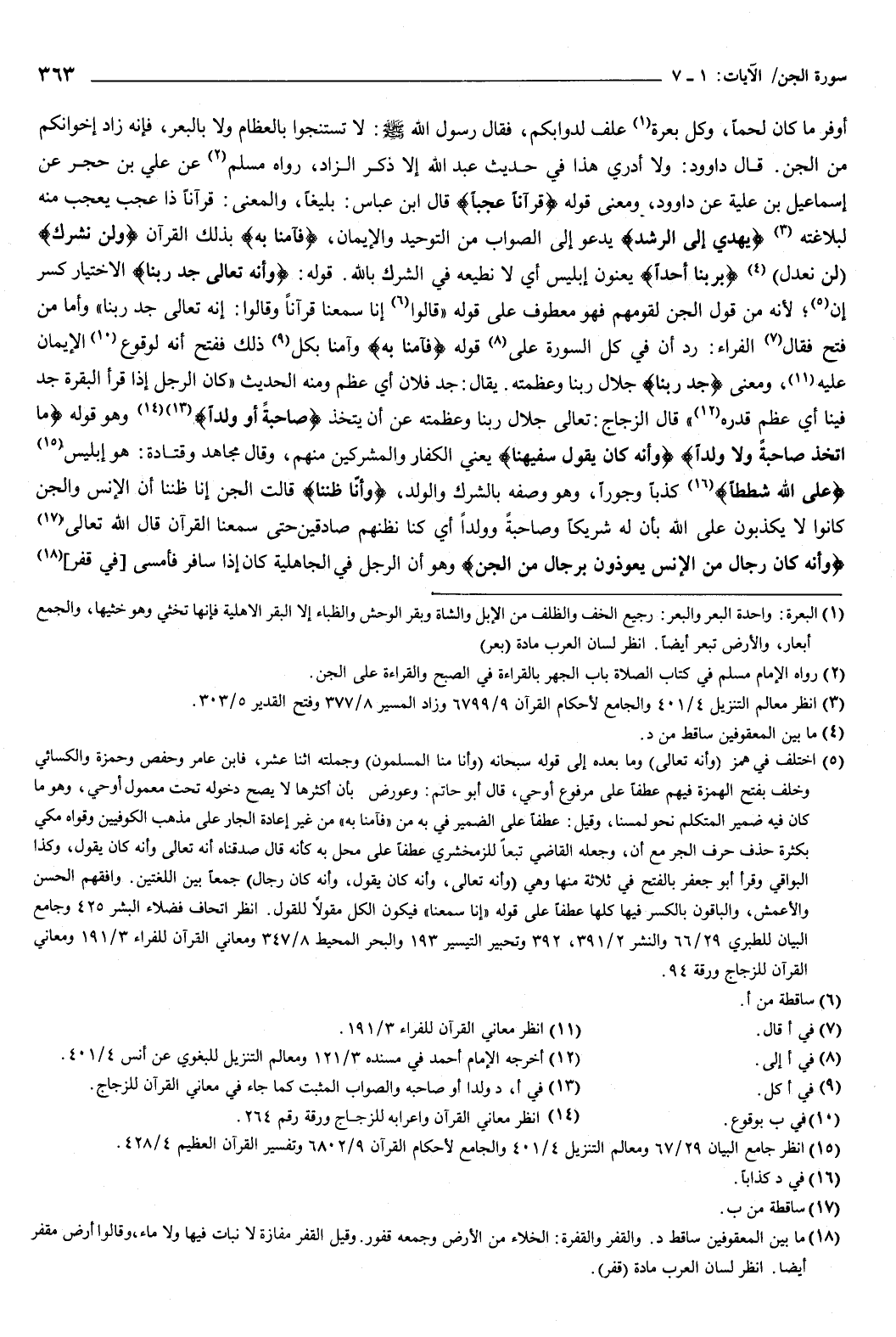 قوله: {وَأَنَّهُ تَعَالَى جَدُّ رَبِّنَا} [الجن: 3] الاختيار كسر إن، لأنه من قول الجن لقومهم، فهو معطوف على قوله: {فَقَالُوا إِنَّا سَمِعْنَا قُرْءَانًا} [الجن: 1] ، وقالوا: وإنه تعالى جد ربنا، وأما من فتح، فقال الفراء: رد أن في كل ال { [على قوله:] فَآمَنَّا بِهِ} [سورة الجن: 2] وآمنا بكل ذلك، ففتح أنه: لوقوع الإيمان عليه، ومعنى: جد ربنا جلال ربنا، وعظمته، يقال: جد فلان.