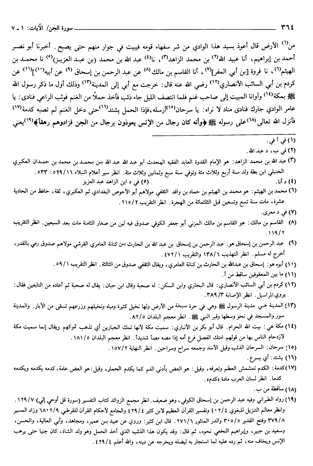 1248 - أَخْبَرَنَا أَبُو نَصْرٍ أَحْمَدُ بْنُ إِبْرَاهِيمَ، أنا عُبَيْدُ اللَّهِ بْنُ مُحَمَّدٍ الزَّاهِدُ، نا عَبْدُ اللَّهِ بْنُ مُحَمَّدِ بْنِ عَبْدِ الْعَزِيزِ، نا مُحَمَّدُ بْنُ الْهَيْثَمِ، نا فَرْوَةُ بْنُ أَبِي المفر، أنا الْقَاسِمُ بْنُ مَالِكٍ، عَنْ عَبْدِ الرَّحْمَنِ بْنِ إِسْحَاقَ، عَنْ أَبِيهِ، عَنْ كَرْدَمِ بْنِ أَبِي السَّائِبِ الأَنْصَارِيِّ رَضِيَ اللَّهُ عَنْهُ، قَالَ: خَرَجْتُ مَعَ أَبِي إِلَى الْمَدِينَةِ، وَذَلِكَ أَوَّلُ مَا ذُكِرَ رَسُولُ اللَّهِ صَلَّى اللهُ عَلَيْهِ وَسَلَّمَ بِمَكَّةَ، وَآوَانَا الْمَبِيتُ إِلَى صَاحِبِ غَنَمٍ، فَلَمَّا انْتَصَفَ اللَّيْلُ جَاءَ ذِئْبٌ، فَأَخَذَ حَمَلًا مِنَ الْغَنَمِ، فَوَثَبَ الرَّاعِي فَنَادَى: يَا عَامِرَ الْوَادِي جَارَكَ، فَنَادَى مُنَادٍ لا نَرَاهُ: يَا سَرْحَانُ أَرْسِلْهُ، فَإِذَا الْحَمَلُ يَشْتَدُّ حَتَّى دَخَلَ الْغَنَمَ لَمْ تُصِبْهُ كَدْمَةٌ، فَأَنْزَلَ اللَّهُ تَعَالَى عَلَى رَسُولِهِ صَلَّى اللهُ عَلَيْهِ وَسَلَّمَ {وَأَنَّهُ كَانَ رِجَالٌ مِنَ الإِنْسِ يَعُوذُونَ بِرِجَالٍ مِنَ الْجِنِّ فَزَادُوهُمْ رَهَقًا} [الجن: 6] يَعْنِي