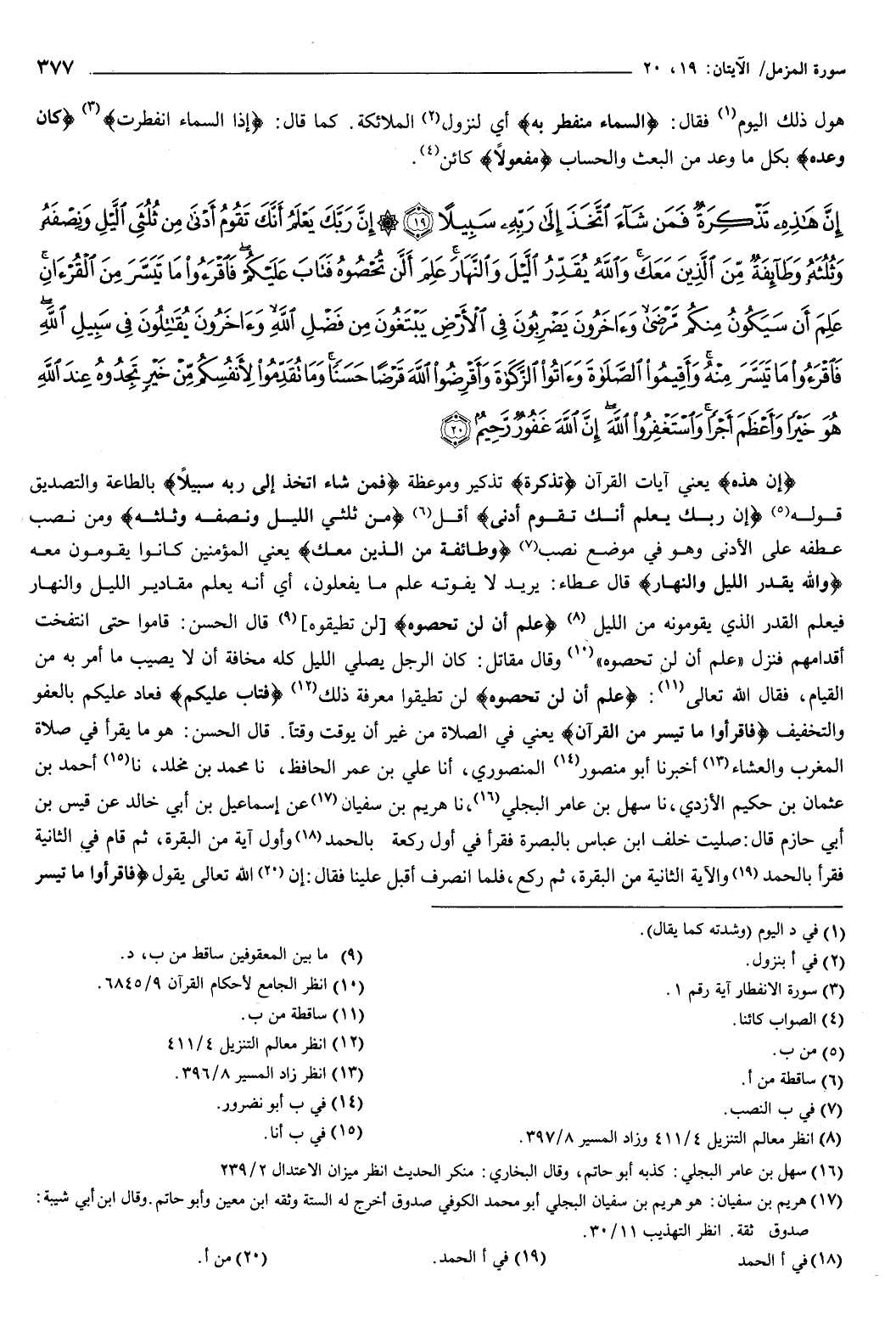 {إِنَّ هَذِهِ تَذْكِرَةٌ فَمَنْ شَاءَ اتَّخَذَ إِلَى رَبِّهِ سَبِيلا {19} إِنَّ رَبَّكَ يَعْلَمُ أَنَّكَ تَقُومُ أَدْنَى مِنْ ثُلُثَيِ اللَّيْلِ وَنِصْفَهُ وَثُلُثَهُ وَطَائِفَةٌ مِنَ الَّذِينَ مَعَكَ وَاللَّهُ يُقَدِّرُ اللَّيْلَ وَالنَّهَارَ عَلِمَ أَنْ لَنْ تُحْصُوهُ فَتَابَ عَلَيْكُمْ فَاقْرَءُوا مَا تَيَسَّرَ مِنَ الْقُرْءَانِ عَلِمَ أَنْ سَيَكُونُ مِنْكُمْ مَرْضَى وَآخَرُونَ يَضْرِبُونَ فِي الأَرْضِ يَبْتَغُونَ مِنْ فَضْلِ اللَّهِ وَآخَرُونَ يُقَاتِلُونَ فِي سَبِيلِ اللَّهِ فَاقْرَءُوا مَا تَيَسَّرَ مِنْهُ وَأَقِيمُوا الصَّلاةَ وَآتُوا الزَّكَاةَ وَأَقْرِضُوا اللَّهَ قَرْضًا حَسَنًا وَمَا تُقَدِّمُوا لأَنْفُسِكُمْ مِنْ خَيْرٍ تَجِدُوهُ عِنْدَ اللَّهِ هُوَ خَيْرًا وَأَعْظَمَ أَجْرًا وَاسْتَغْفِرُوا اللَّهَ إِنَّ اللَّهَ غَفُورٌ رَحِيمٌ {20} } [المزمل: 19-20] .