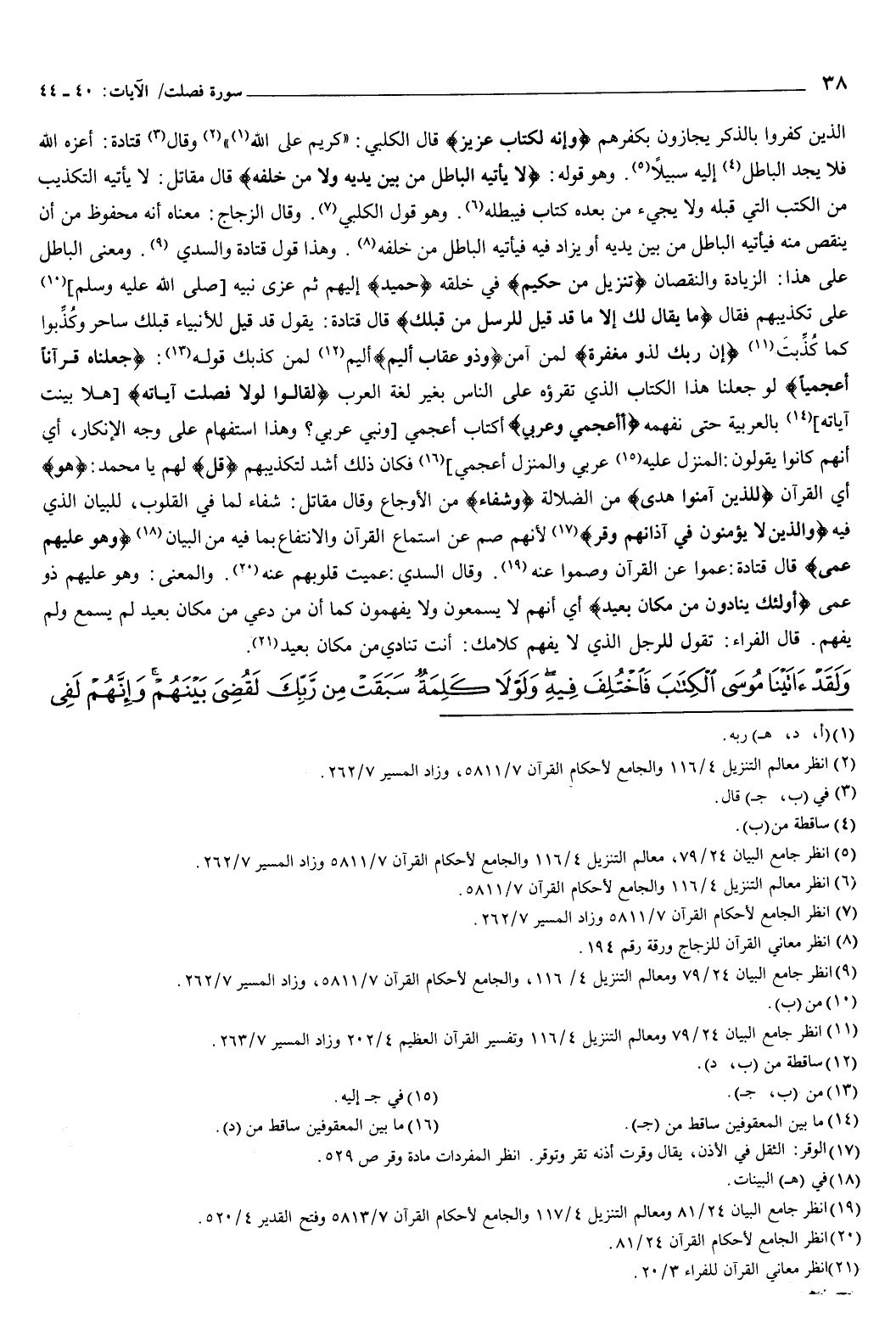 قوله: {جَعَلْنَاهُ قُرْءَانًا أَعْجَمِيًّا} [فصلت: 44] لو جعلنا هذا الكتاب الذي تقرؤه على الناس بغير لغة العرب، {لَقَالُوا لَوْلا فُصِّلَتْ آيَاتُهُ} [فصلت: 44] هلا بينت آياته بالعربية، حتى نفهمه، أأعجمي وعربي أكتاب أعجمي ونبي عربي؟ وهذا استفهام على وجه الإنكار، أي: أنهم كانوا يقولون: المنزل عليه عربي، والمنزل أعجمي، فكان ذلك أشد لتكذيبهم، قل لهم يا محمد: هو أي: القرآن، {لِلَّذِينَ آمَنُوا هُدًى} [فصلت: 44] من الضلالة، وشفاء من الأوجاع، وقال مقاتل: شفاء لما في القلوب، للبيان الذي فيه، {وَالَّذِينَ لا يُؤْمِنُونَ فِي آذَانِهِمْ وَقْرٌ} [فصلت: 44] لأنهم صم عن استماع القرآن، والانتفاع بما فيه من البيان، {وَهُوَ عَلَيْهِمْ عَمًى} [فصلت: 44] قال قتادة: عموا عن القرآن، وصموا عنه.