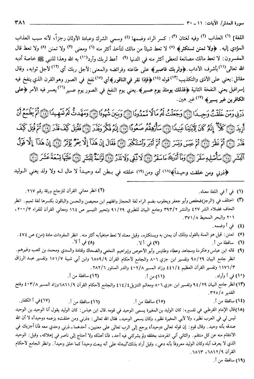 {ذَرْنِي وَمَنْ خَلَقْتُ وَحِيدًا {11} وَجَعَلْتُ لَهُ مَالا مَمْدُودًا {12} وَبَنِينَ شُهُودًا {13} وَمَهَّدْتُ لَهُ تَمْهِيدًا {14} ثُمَّ يَطْمَعُ أَنْ أَزِيدَ {15} كَلَّا إِنَّهُ كَانَ لآيَاتِنَا عَنِيدًا {16} سَأُرْهِقُهُ صَعُودًا {17} إِنَّهُ فَكَّرَ وَقَدَّرَ {18} فَقُتِلَ كَيْفَ قَدَّرَ {19} ثُمَّ قُتِلَ كَيْفَ قَدَّرَ {20} ثُمَّ نَظَرَ {21} ثُمَّ عَبَسَ وَبَسَرَ {22} ثُمَّ أَدْبَرَ وَاسْتَكْبَرَ {23} فَقَالَ إِنْ هَذَا إِلا سِحْرٌ يُؤْثَرُ {24} إِنْ هَذَا إِلا قَوْلُ الْبَشَرِ {25} سَأُصْلِيهِ سَقَرَ {26} وَمَا أَدْرَاكَ مَا سَقَرُ {27} لا تُبْقِي وَلا تَذَرُ {28} لَوَّاحَةٌ لِلْبَشَرِ {29} عَلَيْهَا تِسْعَةَ عَشَرَ {30} } [المدثر: 11-30] .