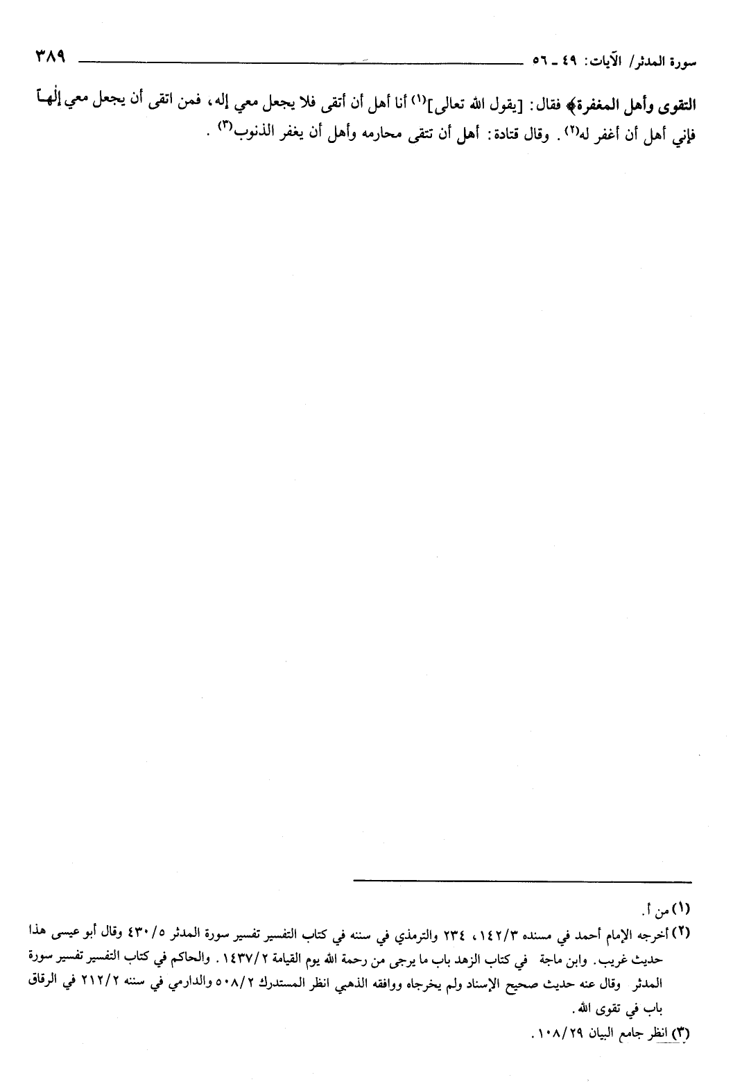 {هُوَ أَهْلُ التَّقْوَى وَأَهْلُ الْمَغْفِرَةِ} [المدثر: 56] فَقَالَ: يَقُولُ اللَّهُ تَعَالَى: أَنَا أَهْلٌ أَنْ أُتَّقَى فَلا يُجْعَلُ مَعِي إِلَهٌ، فَمَنِ اتَّقَى أَنْ يَجْعَلَ مَعِي إِلَهًا فَإِنِّي أَهْلٌ أَنْ أَغْفِرَ لَهُ