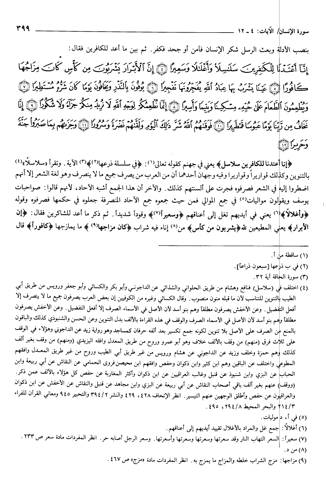 {إِنَّا أَعْتَدْنَا لِلْكَافِرِينَ سَلاسِلا} [الإنسان: 4] يعني: في جهنم، كقوله تعالى: {فِي سِلْسِلَةٍ ذَرْعُهَا} [الحاقة: 32] الآية، وتقرأ: سلاسلًا بالتنوين، وكذلك قواريرًا و {قَوَارِيرَا} [الإنسان: 15] وفيه وجهان: أحدهما: أن من العرب من يصرف جميع ما لا ينصرف، وهو لغة الشعر، إلا أنهم اضطروا إليه في الشعر فصرفوه، فجرت على ألسنتهم كذلك، والآخر: أن هذا الجمع أشبه الآحاد، لأنهم قالوا: صواحبات يوسف.