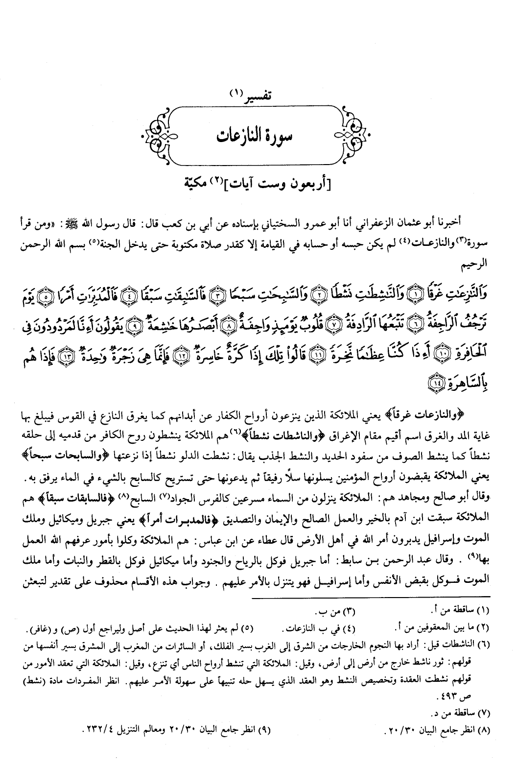 بسم الله الرحمن الرحيم {وَالنَّازِعَاتِ غَرْقًا {1} وَالنَّاشِطَاتِ نَشْطًا {2} وَالسَّابِحَاتِ سَبْحًا {3} فَالسَّابِقَاتِ سَبْقًا {4} فَالْمُدَبِّرَاتِ أَمْرًا {5} يَوْمَ تَرْجُفُ الرَّاجِفَةُ {6} تَتْبَعُهَا الرَّادِفَةُ {7} قُلُوبٌ يَوْمَئِذٍ وَاجِفَةٌ {8} أَبْصَارُهَا خَاشِعَةٌ {9} يَقُولُونَ أَئِنَّا لَمَرْدُودُونَ فِي الْحَافِرَةِ {10} أَئِذَا كُنَّا عِظَامًا نَخِرَةً {11} قَالُوا تِلْكَ إِذًا كَرَّةٌ خَاسِرَةٌ {12} فَإِنَّمَا هِيَ زَجْرَةٌ وَاحِدَةٌ {13} فَإِذَا هُمْ بِالسَّاهِرَةِ {14} } [النازعات: 1-14] .