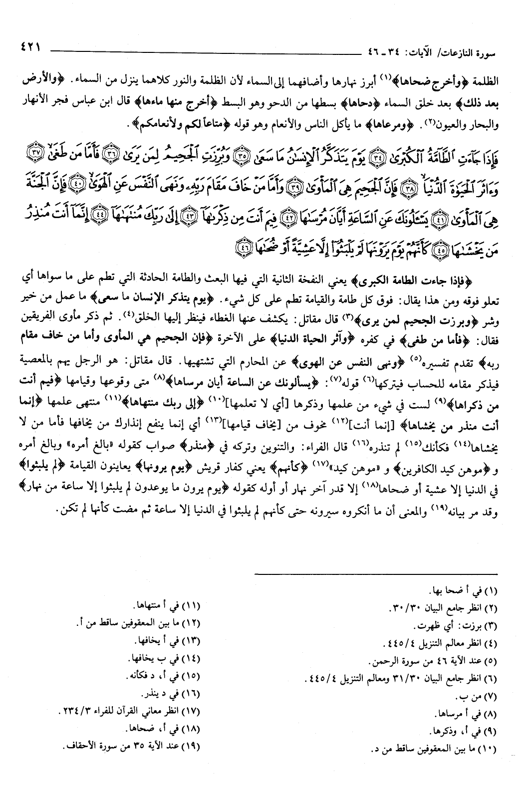 {فَإِذَا جَاءَتِ الطَّامَّةُ الْكُبْرَى {34} يَوْمَ يَتَذَكَّرُ الإِنْسَانُ مَا سَعَى {35} وَبُرِّزَتِ الْجَحِيمُ لِمَنْ يَرَى {36} فَأَمَّا مَنْ طَغَى {37} وَآثَرَ الْحَيَاةَ الدُّنْيَا {38} فَإِنَّ الْجَحِيمَ هِيَ الْمَأْوَى {39} وَأَمَّا مَنْ خَافَ مَقَامَ رَبِّهِ وَنَهَى النَّفْسَ عَنِ الْهَوَى {40} فَإِنَّ الْجَنَّةَ هِيَ الْمَأْوَى {41} يَسْأَلُونَكَ عَنِ السَّاعَةِ أَيَّانَ مُرْسَاهَا {42} فِيمَ أَنْتَ مِنْ ذِكْرَاهَا {43} إِلَى رَبِّكَ مُنْتَهَاهَا {44} إِنَّمَا أَنْتَ مُنْذِرُ مَنْ يَخْشَاهَا {45} كَأَنَّهُمْ يَوْمَ يَرَوْنَهَا لَمْ يَلْبَثُوا إِلا عَشِيَّةً أَوْ ضُحَاهَا {46} } [النازعات: 34-46] .