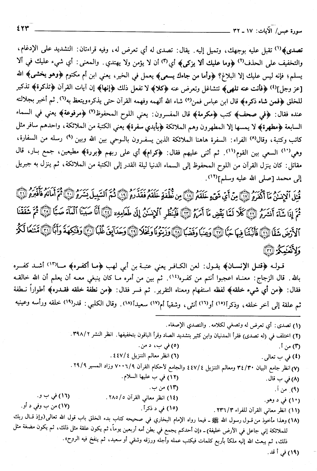 {قُتِلَ الإِنْسَانُ مَا أَكْفَرَهُ {17} مِنْ أَيِّ شَيْءٍ خَلَقَهُ {18} مِنْ نُطْفَةٍ خَلَقَهُ فَقَدَّرَهُ {19} ثُمَّ السَّبِيلَ يَسَّرَهُ {20} ثُمَّ أَمَاتَهُ فَأَقْبَرَهُ {21} ثُمَّ إِذَا شَاءَ أَنْشَرَهُ {22} كَلَّا لَمَّا يَقْضِ مَا أَمَرَهُ {23} فَلْيَنْظُرِ الإِنْسَانُ إِلَى طَعَامِهِ {24} أَنَّا صَبَبْنَا الْمَاءَ صَبًّا {25} ثُمَّ شَقَقْنَا الأَرْضَ شَقًّا {26} فَأَنْبَتْنَا فِيهَا حَبًّا {27} وَعِنَبًا وَقَضْبًا {28} وَزَيْتُونًا وَنَخْلا {29} وَحَدَائِقَ غُلْبًا {30} وَفَاكِهَةً وَأَبًّا {31} مَتَاعًا لَكُمْ وَلأَنْعَامِكُمْ {32} } [عبس: 17-32] .