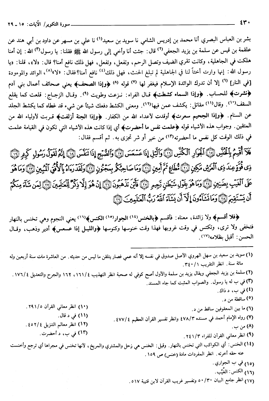 ثم أقسم، فقال: {فَلا أُقْسِمُ بِالْخُنَّسِ {15} الْجَوَارِ الْكُنَّسِ {16} وَاللَّيْلِ إِذَا عَسْعَسَ {17} وَالصُّبْحِ إِذَا تَنَفَّسَ {18} إِنَّهُ لَقَوْلُ رَسُولٍ كَرِيمٍ {19} ذِي قُوَّةٍ عِنْدَ ذِي الْعَرْشِ مَكِينٍ {20} مُطَاعٍ ثَمَّ أَمِينٍ {21} وَمَا صَاحِبُكُمْ بِمَجْنُونٍ {22} وَلَقَدْ رَآهُ بِالأُفُقِ الْمُبِينِ {23} وَمَا هُوَ عَلَى الْغَيْبِ بِضَنِينٍ {24} وَمَا هُوَ بِقَوْلِ شَيْطَانٍ رَجِيمٍ {25} فَأَيْنَ تَذْهَبُونَ {26} إِنْ هُوَ إِلا ذِكْرٌ لِلْعَالَمِينَ {27} لِمَنْ شَاءَ مِنْكُمْ أَنْ يَسْتَقِيمَ {28} وَمَا تَشَاءُونَ إِلا أَنْ يَشَاءَ اللَّهُ رَبُّ الْعَالَمِينَ {29} } [التكوير: 15-29] .