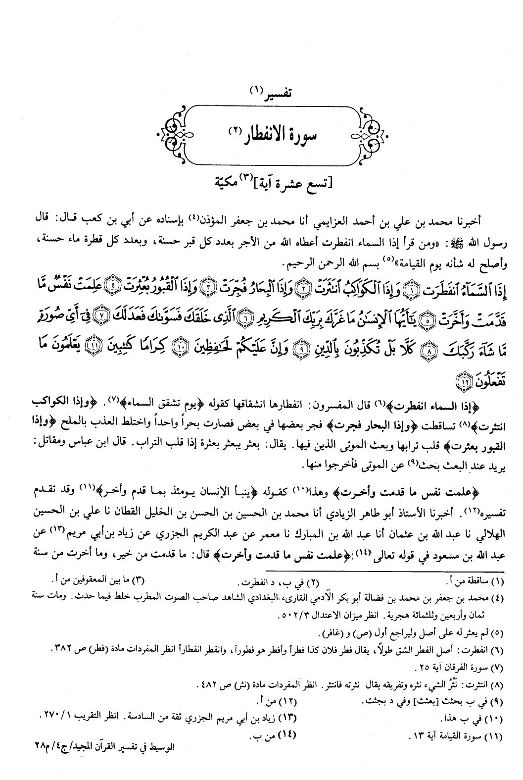 بسم الله الرحمن الرحيم {إِذَا السَّمَاءُ انْفَطَرَتْ {1} وَإِذَا الْكَوَاكِبُ انْتَثَرَتْ {2} وَإِذَا الْبِحَارُ فُجِّرَتْ {3} وَإِذَا الْقُبُورُ بُعْثِرَتْ {4} عَلِمَتْ نَفْسٌ مَا قَدَّمَتْ وَأَخَّرَتْ {5} يَأَيُّهَا الإِنْسَانُ مَا غَرَّكَ بِرَبِّكَ الْكَرِيمِ {6} الَّذِي خَلَقَكَ فَسَوَّاكَ فَعَدَلَكَ {7} فِي أَيِّ صُورَةٍ مَا شَاءَ رَكَّبَكَ {8} كَلَّا بَلْ تُكَذِّبُونَ بِالدِّينِ {9} وَإِنَّ عَلَيْكُمْ لَحَافِظِينَ {10} كِرَامًا كَاتِبِينَ {11} يَعْلَمُونَ مَا تَفْعَلُونَ {12} } [الانفطار: 1-12] .
