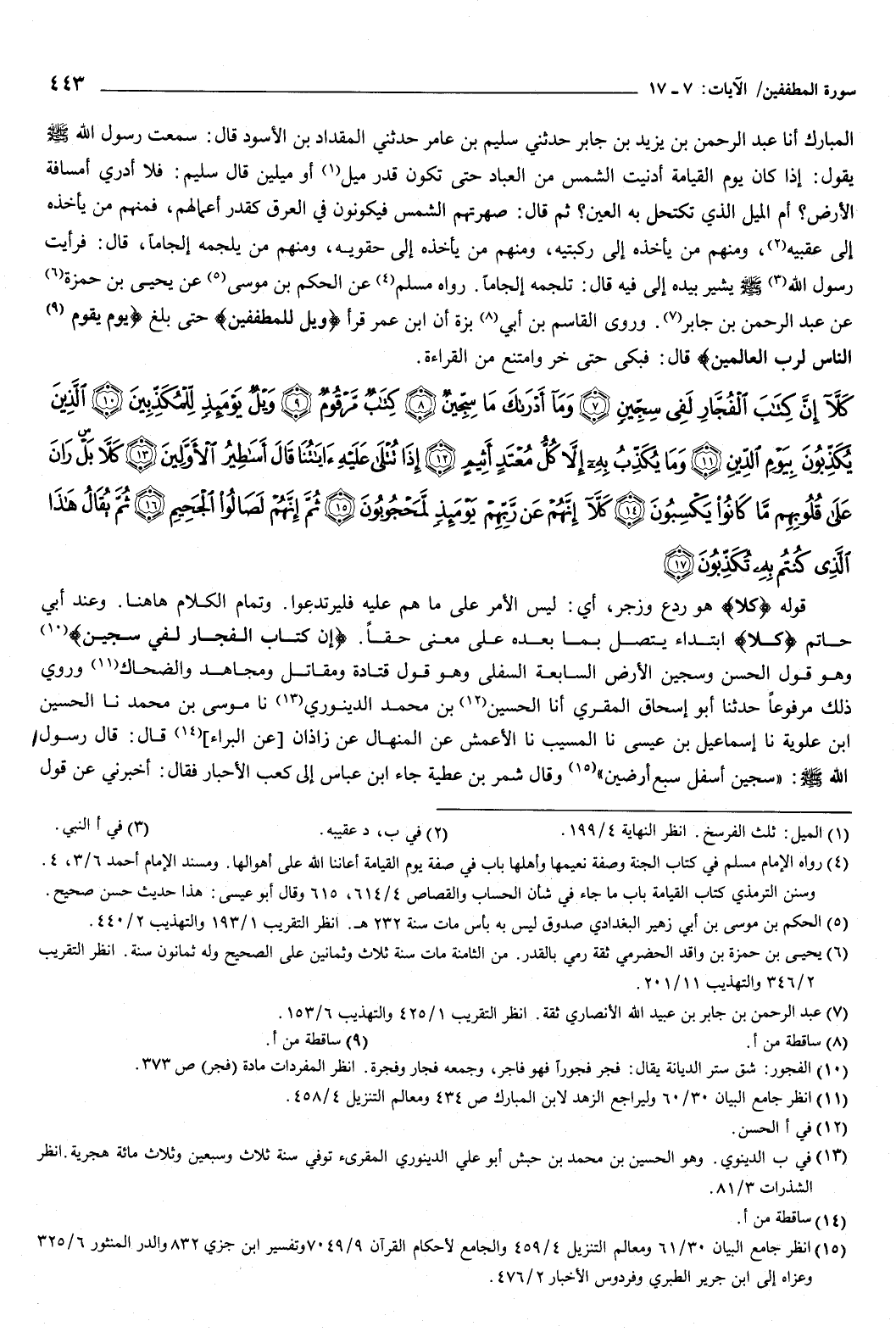 {كَلَّا إِنَّ كِتَابَ الْفُجَّارِ لَفِي سِجِّينٍ {7} وَمَا أَدْرَاكَ مَا سِجِّينٌ {8} كِتَابٌ مَرْقُومٌ {9} وَيْلٌ يَوْمَئِذٍ لِلْمُكَذِّبِينَ {10} الَّذِينَ يُكَذِّبُونَ بِيَوْمِ الدِّينِ {11} وَمَا يُكَذِّبُ بِهِ إِلا كُلُّ مُعْتَدٍ أَثِيمٍ {12} إِذَا تُتْلَى عَلَيْهِ آيَاتُنَا قَالَ أَسَاطِيرُ الأَوَّلِينَ {13} كَلَّا بَلْ رَانَ عَلَى قُلُوبِهِمْ مَا كَانُوا يَكْسِبُونَ {14} كَلَّا إِنَّهُمْ عَنْ رَبِّهِمْ يَوْمَئِذٍ لَمَحْجُوبُونَ {15} ثُمَّ إِنَّهُمْ لَصَالُو الْجَحِيمِ {16} ثُمَّ يُقَالُ هَذَا الَّذِي كُنْتُمْ بِهِ تُكَذِّبُونَ {17} } [المطففين: 7-17] .