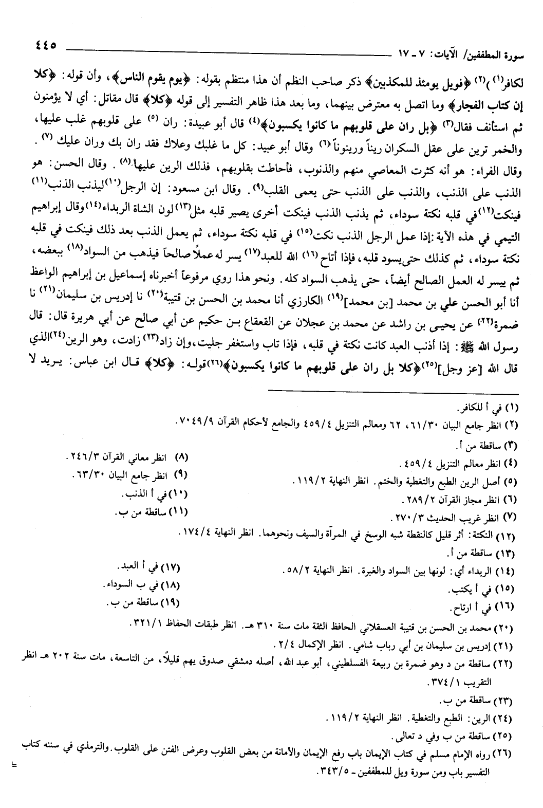 وقال ابن مسعود: إن الرجل ليذنب الذنب، فينكت في قلبه نكته سوداء، ثم يذنب الذنب، فينكت أخرى، يصير قلبه مثل لون الشاة الربداء.