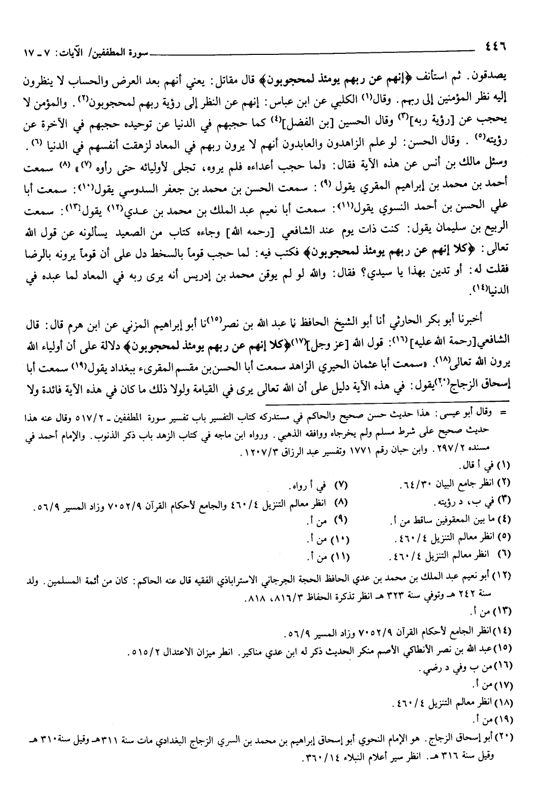 سمعت أبا عثمان الحيري الزاهد، سمعت أبا الحسن بن مقسم المقرئ ببغداد، يقول: سمعت أبا إسحاق الزجاج، يقول: في هذه الآية دليل على أن الله تعالى يرى في القيامة، ولولا ذلك ما كان في هذه الآية فائدة، ولا