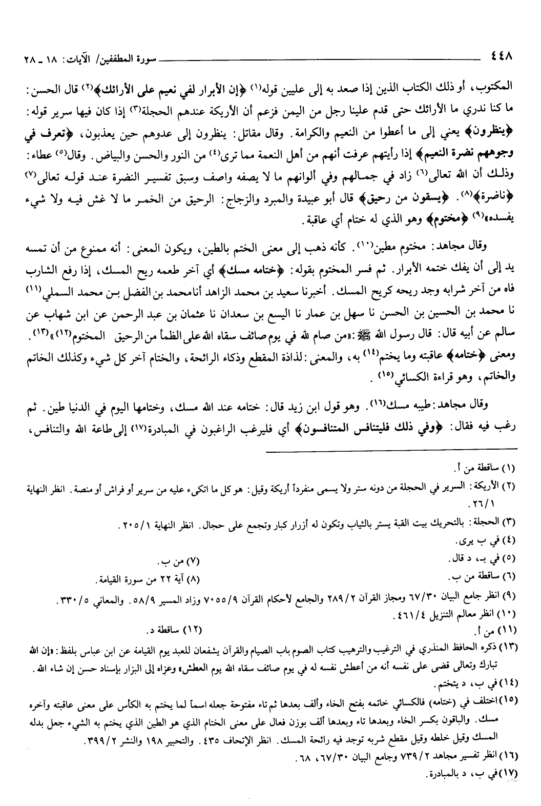 ثم فسر المختوم، بقوله: ختامه مسك أي: آخر طعمه ريح المسك، إذا رفع الشارب فاه من آخر شرابه، وجد ريحه كريح المسك.