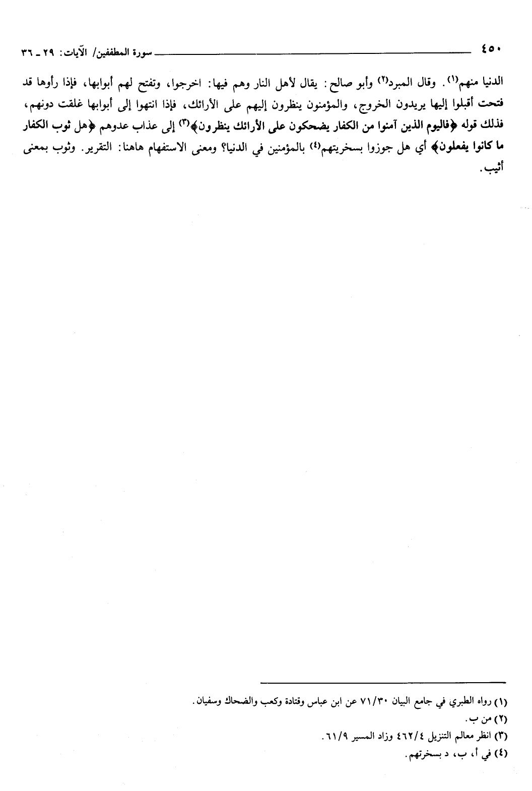 {هَلْ ثُوِّبَ الْكُفَّارُ مَا كَانُوا يَفْعَلُونَ} [المطففين: 36] أي: هل جوزوا بسخريتهم بالمؤمنين في الدنيا؟ ومعنى الاستفهام ههنا: التقرير، وثوب بمعنى أثيب.