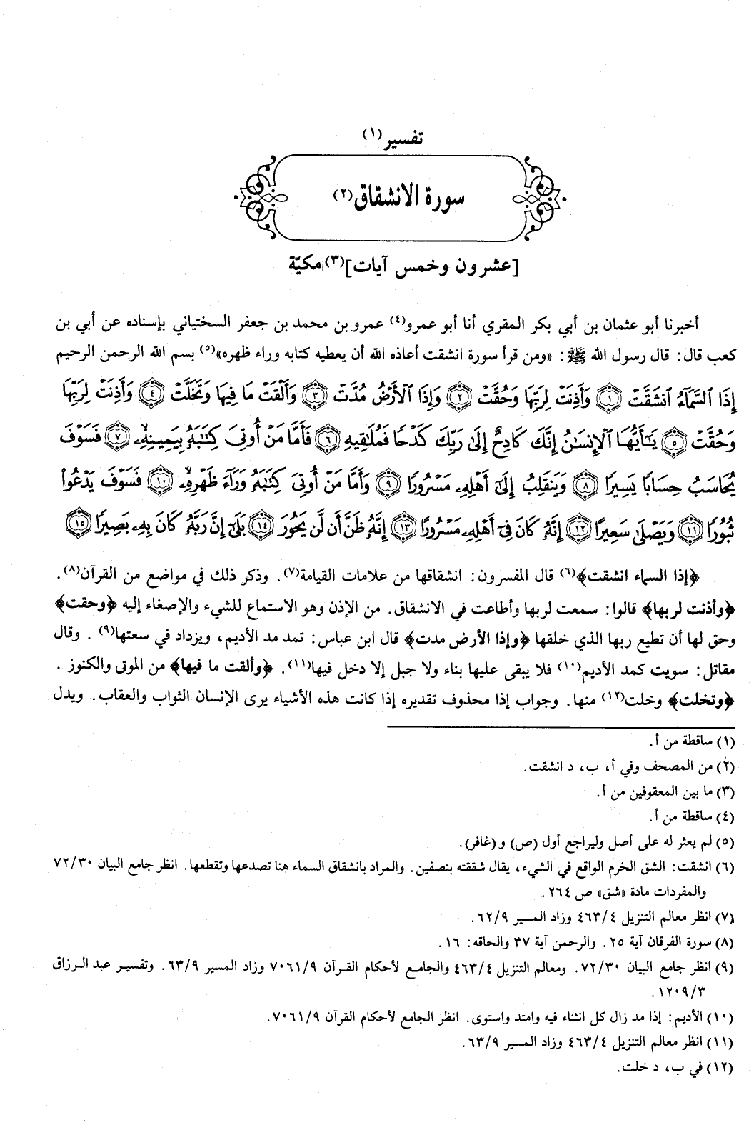 بسم الله الرحمن الرحيم {إِذَا السَّمَاءُ انْشَقَّتْ {1} وَأَذِنَتْ لِرَبِّهَا وَحُقَّتْ {2} وَإِذَا الأَرْضُ مُدَّتْ {3} وَأَلْقَتْ مَا فِيهَا وَتَخَلَّتْ {4} وَأَذِنَتْ لِرَبِّهَا وَحُقَّتْ {5} يَأَيُّهَا الإِنْسَانُ إِنَّكَ كَادِحٌ إِلَى رَبِّكَ كَدْحًا فَمُلاقِيهِ {6} فَأَمَّا مَنْ أُوتِيَ كِتَابَهُ بِيَمِينِهِ {7} فَسَوْفَ يُحَاسَبُ حِسَابًا يَسِيرًا {8} وَيَنْقَلِبُ إِلَى أَهْلِهِ مَسْرُورًا {9} وَأَمَّا مَنْ أُوتِيَ كِتَابَهُ وَرَاءَ ظَهْرِهِ {10} فَسَوْفَ يَدْعُو ثُبُورًا {11} وَيَصْلَى سَعِيرًا {12} إِنَّهُ كَانَ فِي أَهْلِهِ مَسْرُورًا {13} إِنَّهُ ظَنَّ أَنْ لَنْ يَحُورَ {14} بَلَى إِنَّ رَبَّهُ كَانَ بِهِ بَصِيرًا {15} } [الانشقاق: 1-15] .