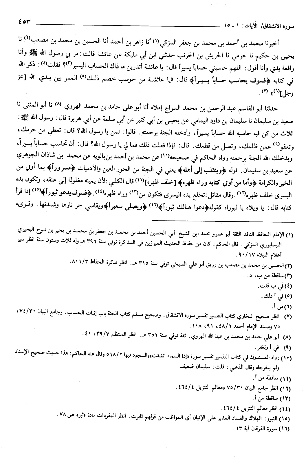 1309 - أَخْبَرَنَا مُحَمَّدُ بْنُ أَحْمَدَ بْنِ مُحَمَّدِ بْنِ جَعْفَرٍ الْمُزَكِّي، أنا زَاهِرُ بْنُ أَحْمَدَ، أنا الْحُسَيْنُ بْنُ مُحَمَّدِ بْنِ مُصْعَبٍ، نا يَحْيَى بْنُ حَكِيمٍ، نا حَرَمِيٌّ، نا الْحَرِيشُ بْنُ الْخِرِّيتِ، حَدَّثَنِي ابْنُ أَبِي مُلَيْكَةَ، عَنْ عَائِشَةَ، قَالَتْ: مَرَّ بِي رَسُولُ اللَّهِ صَلَّى اللهُ عَلَيْهِ وَسَلَّمَ وَأَنَا رَافِعَةٌ يَدَيَّ وَأَنَا أَقُولُ: اللَّهُمَّ حَاسِبْنِي حِسَابًا يَسِيرًا، قَالَ: يَا عَائِشَةُ أَتَدْرِينَ مَا ذَاكَ الْحِسَابُ الْيَسِيرُ؟ فَقُلْتُ: ذَكَرَ اللَّهُ فِي كِتَابِهِ {فَسَوْفَ يُحَاسَبُ حِسَابًا يَسِيرًا} [الانشقاق: 8] قَالَ: «يَا عَائِشَةُ مَنْ حُوسِبَ خصم ذَلِكَ الممر بَيْنَ يَدَيِ اللَّهِ عَزَّ وَجَلَّ» .
