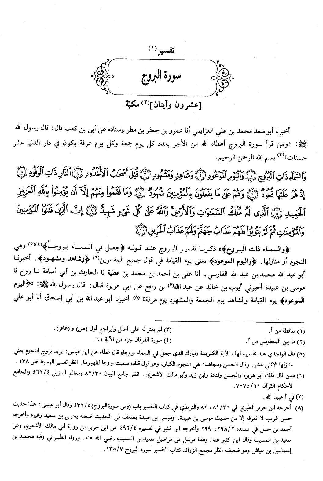 1315 - أَخْبَرَنَا أَبُو سَعْدٍ مُحَمَّدُ بْنُ عَلِيٍّ الْعَزَايِمِيُّ، أنا عَمْرُو بْنُ جَعْفَرِ بْنِ مَطَرٍ بِإِسْنَادِهِ، عَنْ أُبَيِّ بْنِ كَعْبٍ، قَالَ: قَالَ رَسُولُ اللَّهِ صَلَّى اللهُ عَلَيْهِ وَسَلَّمَ: «وَمَنْ قَرَأَ سُورَةَ الْبُرُوجِ أَعْطَاهُ اللَّهُ مِنَ الْأَجْرِ بِعَدَدِ كُلِّ يَوْمِ جُمُعَةٍ، وَكُلِّ يَوْمِ عَرَفَةَ يَكُونُ فِي دَارِ الدُّنْيَا عَشْرُ حَسَنَاتٍ» .