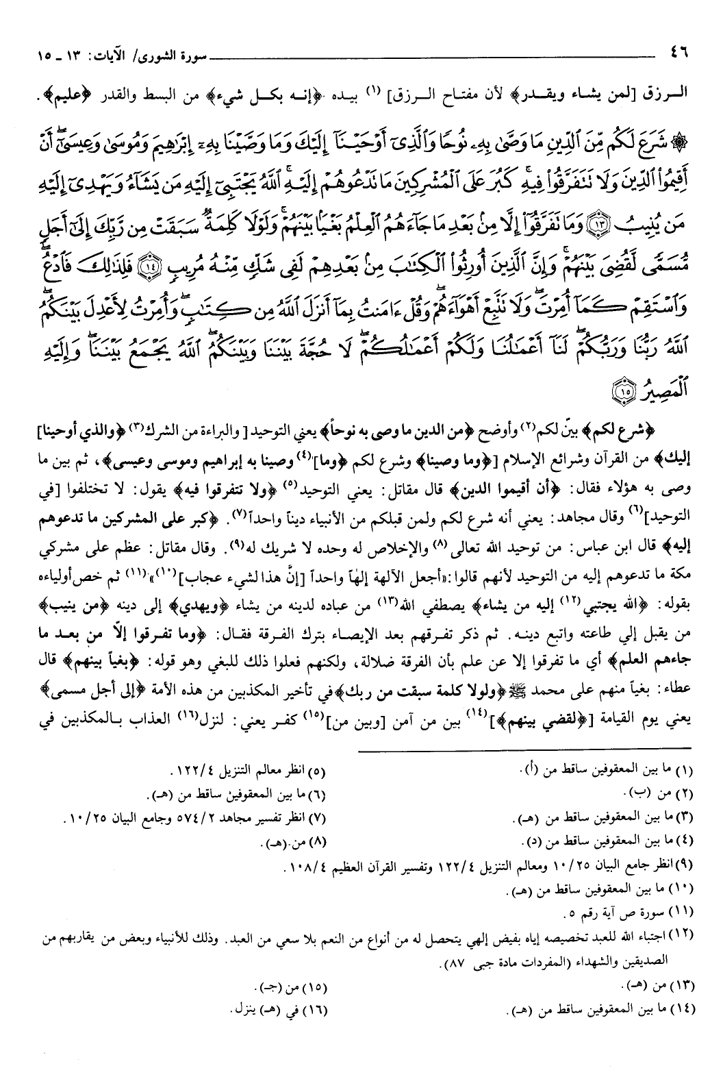 {شَرَعَ لَكُمْ مِنَ الدِّينِ مَا وَصَّى بِهِ نُوحًا وَالَّذِي أَوْحَيْنَا إِلَيْكَ وَمَا وَصَّيْنَا بِهِ إِبْرَاهِيمَ وَمُوسَى وَعِيسَى أَنْ أَقِيمُوا الدِّينَ وَلا تَتَفَرَّقُوا فِيهِ كَبُرَ عَلَى الْمُشْرِكِينَ مَا تَدْعُوهُمْ إِلَيْهِ اللَّهُ يَجْتَبِي إِلَيْهِ مَنْ يَشَاءُ وَيَهْدِي إِلَيْهِ مَنْ يُنِيبُ {13} وَمَا تَفَرَّقُوا إِلا مِنْ بَعْدِ مَا جَاءَهُمُ الْعِلْمُ بَغْيًا بَيْنَهُمْ وَلَوْلا كَلِمَةٌ سَبَقَتْ مِنْ رَبِّكَ إِلَى أَجَلٍ مُسَمًّى لَقُضِيَ بَيْنَهُمْ وَإِنَّ الَّذِينَ أُورِثُوا الْكِتَابَ مِنْ بَعْدِهِمْ لَفِي شَكٍّ مِنْهُ مُرِيبٍ {14} فَلِذَلِكَ فَادْعُ وَاسْتَقِمْ كَمَا أُمِرْتَ وَلا تَتَّبِعْ أَهْوَاءَهُمْ وَقُلْ آمَنْتُ بِمَا أَنْزَلَ اللَّهُ مِنْ كِتَابٍ وَأُمِرْتُ لأَعْدِلَ بَيْنَكُمُ اللَّهُ رَبُّنَا وَرَبُّكُمْ لَنَا أَعْمَالُنَا وَلَكُمْ أَعْمَالُكُمْ لا حُجَّةَ بَيْنَنَا وَبَيْنَكُمُ اللَّهُ يَجْمَعُ بَيْنَنَا وَإِلَيْهِ الْمَصِيرُ {15} } [الشورى: 13-15] .