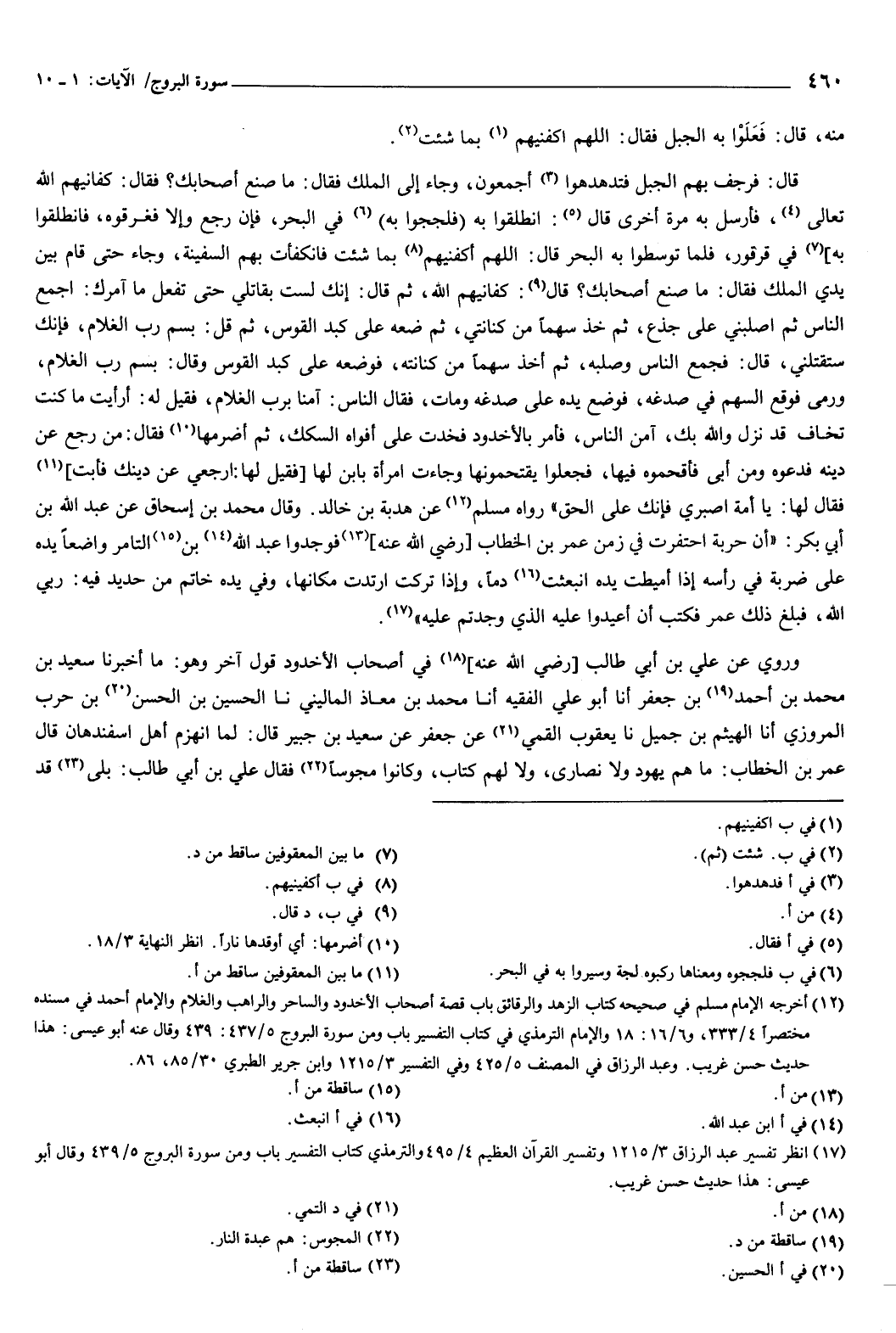 مِنْهُ، قَالَ: فَعَلَوْا بِهِ الْجَبَلَ، فَقَالَ: اللَّهُمَّ اكْفِنِيهِمْ بِمَا شِئْتَ، قَالَ: فَرَجَفَ بِهِمُ الْجَبَلُ فَتَدَهْدَهُوا أَجْمَعُونَ، وَجَاءَ إِلَى الْمَلِكِ، فَقَالَ: مَا صَنَعَ أَصْحَابُكَ؟ فَقَالَ: كَفَانِيهِمُ اللَّهُ تَعَالَى، فَأَرْسَلَ بِهِ مَرَّةً أُخْرَى، قَالَ: انْطَلِقُوا بِهِ فَلَجِّجُوا بِهِ فِي الْبَحْرِ، فَإِنْ رَجَعَ وَإِلا فَغَرِّقُوهُ، فَانْطَلَقُوا بِهِ فِي قُرْقُورٍ، فَلَمَّا تَوَسَّطُوا بِهِ الْبَحْرَ، قَالَ: اللَّهُمَّ اكْفِنِيهِمْ بِمَا شِئْتَ، فَانْكَفَأَتْ بِهِمُ السَّفِينَةُ، وَجَاءَ حَتَّى قَامَ بَيْنَ يَدَيِ الْمَلِكِ، فَقَالَ: مَا صَنَعَ أَصْحَابُكَ؟ قَالَ: كَفَانِيهِمُ اللَّهُ، ثُمَّ قَالَ: إِنَّكَ لَسْتَ بِقَاتِلِي حَتَّى تَفْعَلَ مَا آمُرُكَ، اجْمَعِ النَّاسَ ثُمَّ اصْلُبْنِي عَلَى جِذْعٍ، ثُمَّ خُذْ سَهْمًا مِنْ كِنَانَتِي، ثُمَّ ضَعْهُ عَلَى كَبْدِ الْقَوْسِ، ثُمَّ قُلْ: بِسْمِ رَبِّ الْغُلامِ، فَإِنَّكَ سَتَقْتُلُنِي، قَالَ: فَجَمَعَ النَّاسَ وَصَلَبَهُ، ثُمَّ أَخَذَ سَهْمًا مِنْ كِنَانَتِهِ، فَوَضَعَهُ عَلَى كَبْدِ الْقَوْسِ، وَقَالَ: بِسْمِ رَبِّ الْغُلامِ، وَرَمَى فَوَقَعَ السَّهْمُ فِي صُدْغِهِ، فَوَضَعَ يَدَهُ عَلَى صُدْغِهِ وَمَاتَ، فَقَالَ النَّاسُ: آمَنَّا بِرَبِّ الْغُلامِ، فَقِيلَ لَهُ: أَرَأَيْتَ مَا كُنْتَ تَخَافُ قَدْ نَزَلَ وَاللَّهِ بِكَ، آمَنَ النَّاسُ فَأَمَرَ بِالْأُخْدُودِ، فَخُدَّتْ عَلَى أَفْوَاهِ السِّكَكِ، ثُمَّ أَضْرَمَهَا، فَقَالَ: مَنْ رَجَعَ عَنْ دِينِهِ، فَدَعُوهُ وَمَنْ أَبَى فَأَقْحِمُوهُ فِيهَا، فَجَعَلُوا يَقْتَحِمُونَهَا وَجَاءَتِ امْرَأةٌ بِابْنٍ لَهَا، فَقِيلَ لَهَا: ارْجِعِي عَنْ دِينِكِ، فَأَبَتْ، فَقَالَ لَهَا: يَا أُمَّهْ اصْبِرِي، فَإِنَّكَ عَلَى الْحَقِّ، رَوَاهُ مُسْلِمٌ عَنْ هُدْبَةَ بْنِ خَالِدٍ