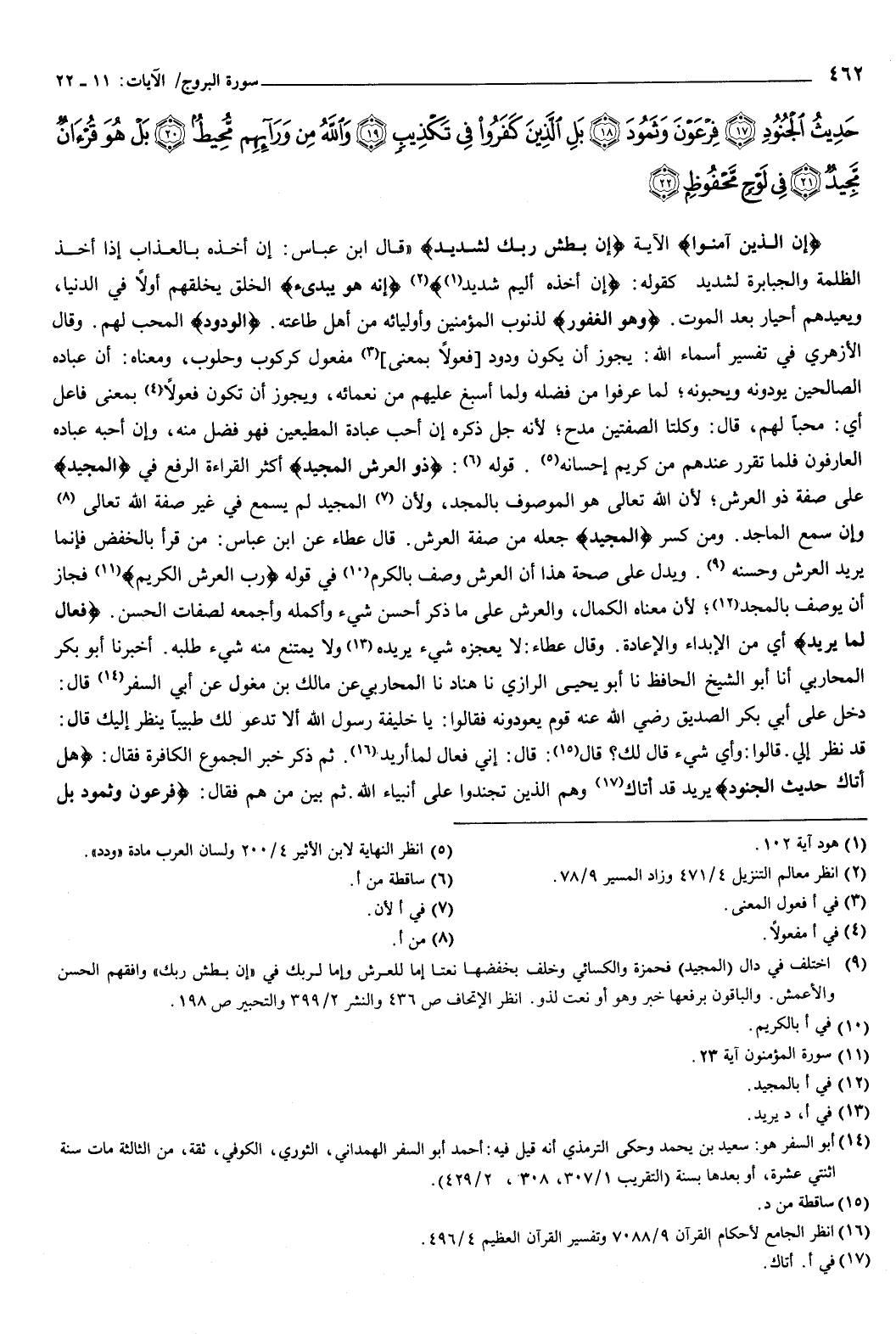 قوله: {ذُو الْعَرْشِ الْمَجِيدُ} [البروج: 15] أكثر القراءة الرفع في: المجيد على صفة: ذو العرش، لأن الله تعالى هو الموصوف بالمجد، ولأن المجيد لم يسمع في غير صفة الله تعالى، وإن سمع الماجد، ومن كسر المجيد جعله من صفة العرش، قال عطاء، عن ابن عباس: من قرأ بالخفض، فإنما يريد العرش وحسنه.