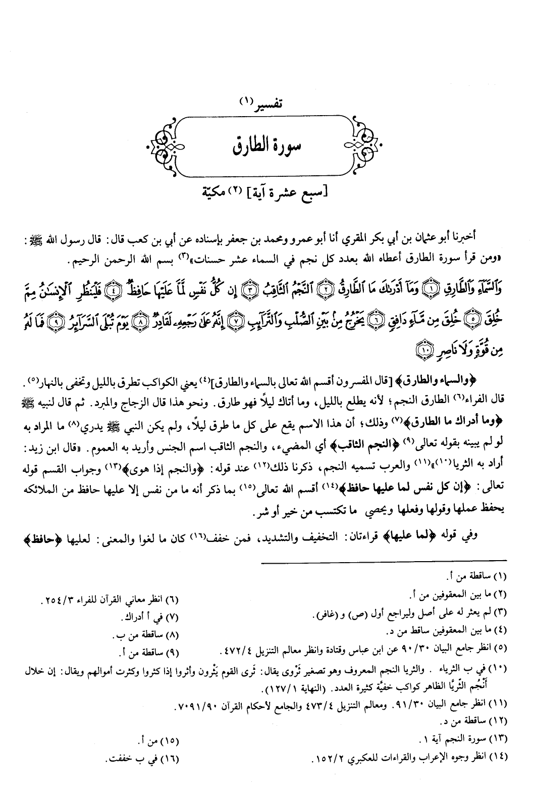 1324 - أَخْبَرَنَا أَبُو عُثْمَانَ بْنُ أَبِي بَكْرٍ الْمُقْرِي، أنا أَبُو عَمْرٍو َمُحَمَّدُ بْنُ جَعْفَرٍ بِإِسْنَادِهِ عَنْ أُبَيِّ بْنِ كَعْبٍ، قَالَ: قَالَ رَسُولُ اللَّهِ صَلَّى اللهُ عَلَيْهِ وَسَلَّمَ: «وَمَنْ قَرَأَ سُورَةَ الطَّارِق أَعْطَاهُ اللَّهُ بِعَدَدِ كُلِّ نَجْمٍ فِي السَّمَاءِ عَشْرُ حَسَنَاتٍ»