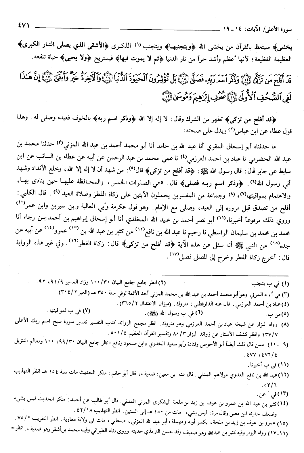 1333 - أَخْبَرَنَاهُ أَبُو نَصْرٍ أَحْمَدُ بْنُ عُبَيْدِ اللَّهِ الْمَخْلَدِيُّ، أنا أَبُو إِسْحَاقَ إِبْرَاهِيمُ بْنُ أَحْمَدَ بْنِ رَجَاءٍ، أنا مُحَمَّدُ بْنُ مُحَمَّدِ بْنِ سُلَيْمَانَ الْوَاسِطِيُّ، نا رحيم، نا عَبْدُ اللَّهِ بْنُ نَافِعٍ، عَنْ كَثِيرِ بْنِ عَبْدِ اللَّهِ بْنِ عَمْرٍو، عَنْ أَبِيهِ، عَنْ جَدِّهِ، عَنِ النَّبِيِّ صَلَّى اللهُ عَلَيْهِ وَسَلَّمَ أَنَّهُ سُئِلَ عَنْ هَذِهِ الآيَةِ {قَدْ أَفْلَحَ مَنْ تَزَكَّى} [الأَعْلَى: 14] قَالَ: زَكَاةُ الْفِطْرِ، وَفِي غَيْرِ هَذِهِ الرِّوَايَةِ، قَالَ: أَخْرَجَ زَكَاةَ الْفِطْرِ وَخَرَجَ إِلَى الْمُصَلَّى فَصَلَّى.
