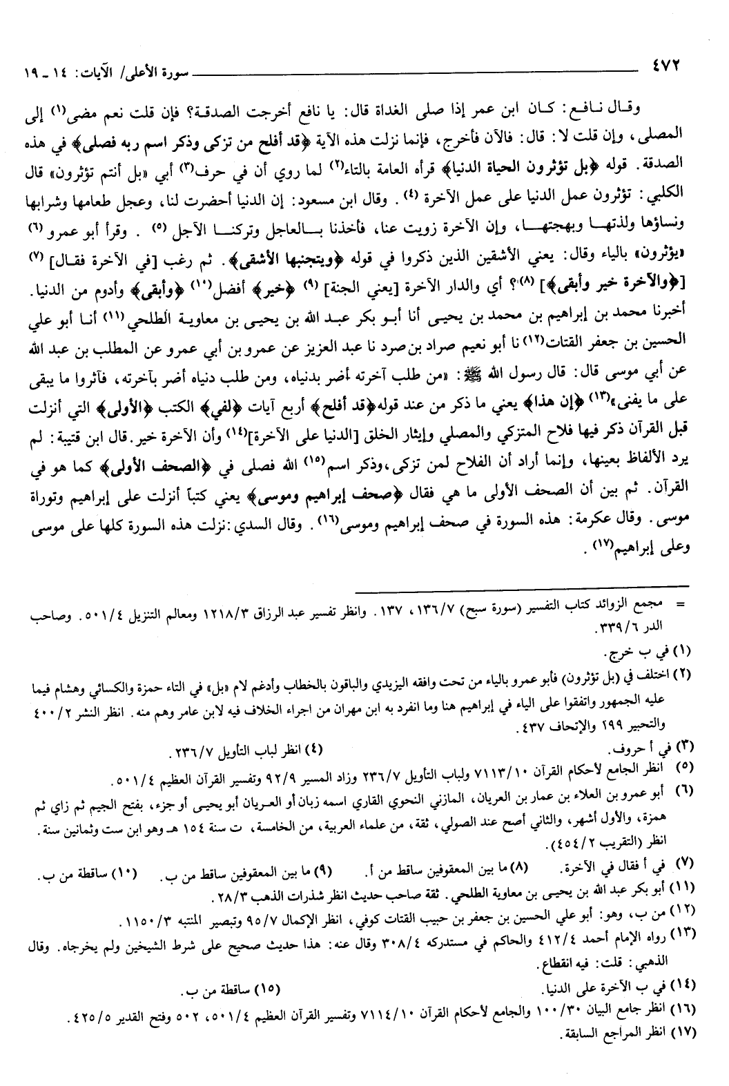 قوله: {بَلْ تُؤْثِرُونَ الْحَيَاةَ الدُّنْيَا} [الأعلى: 16] قرأه العامة بالتاء، لما روي أن في حرف أبي: بل أنتم تؤثرون، قال الكلبي: تؤثرون عمل الدنيا على عمل الآخرة.