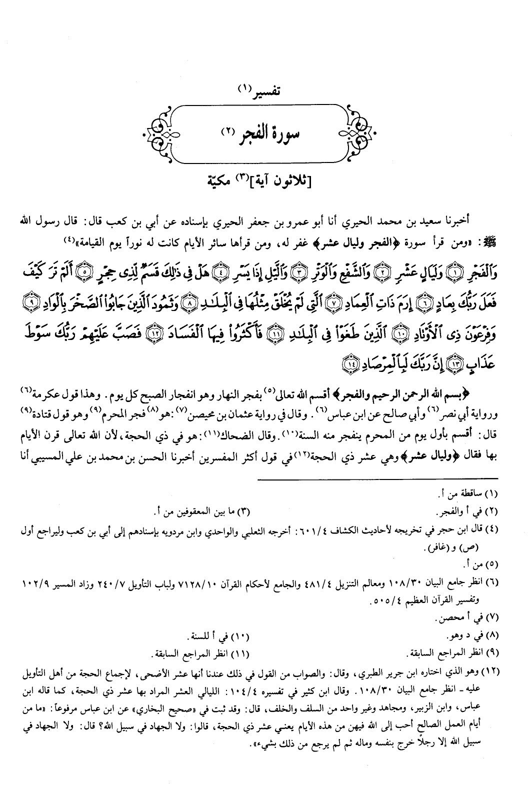 بسم الله الرحمن الرحيم {وَالْفَجْرِ {1} وَلَيَالٍ عَشْرٍ {2} وَالشَّفْعِ وَالْوَتْرِ {3} وَاللَّيْلِ إِذَا يَسْرِ {4} هَلْ فِي ذَلِكَ قَسَمٌ لِذِي حِجْرٍ {5} أَلَمْ تَرَ كَيْفَ فَعَلَ رَبُّكَ بِعَادٍ {6} إِرَمَ ذَاتِ الْعِمَادِ {7} الَّتِي لَمْ يُخْلَقْ مِثْلُهَا فِي الْبِلادِ {8} وَثَمُودَ الَّذِينَ جَابُوا الصَّخْرَ بِالْوَادِ {9} وَفِرْعَوْنَ ذِي الأَوْتَادِ {10} الَّذِينَ طَغَوْا فِي الْبِلادِ {11} فَأَكْثَرُوا فِيهَا الْفَسَادَ {12} فَصَبَّ عَلَيْهِمْ رَبُّكَ سَوْطَ عَذَابٍ {13} إِنَّ رَبَّكَ لَبِالْمِرْصَادِ {14} } [الفجر: 1-14] .