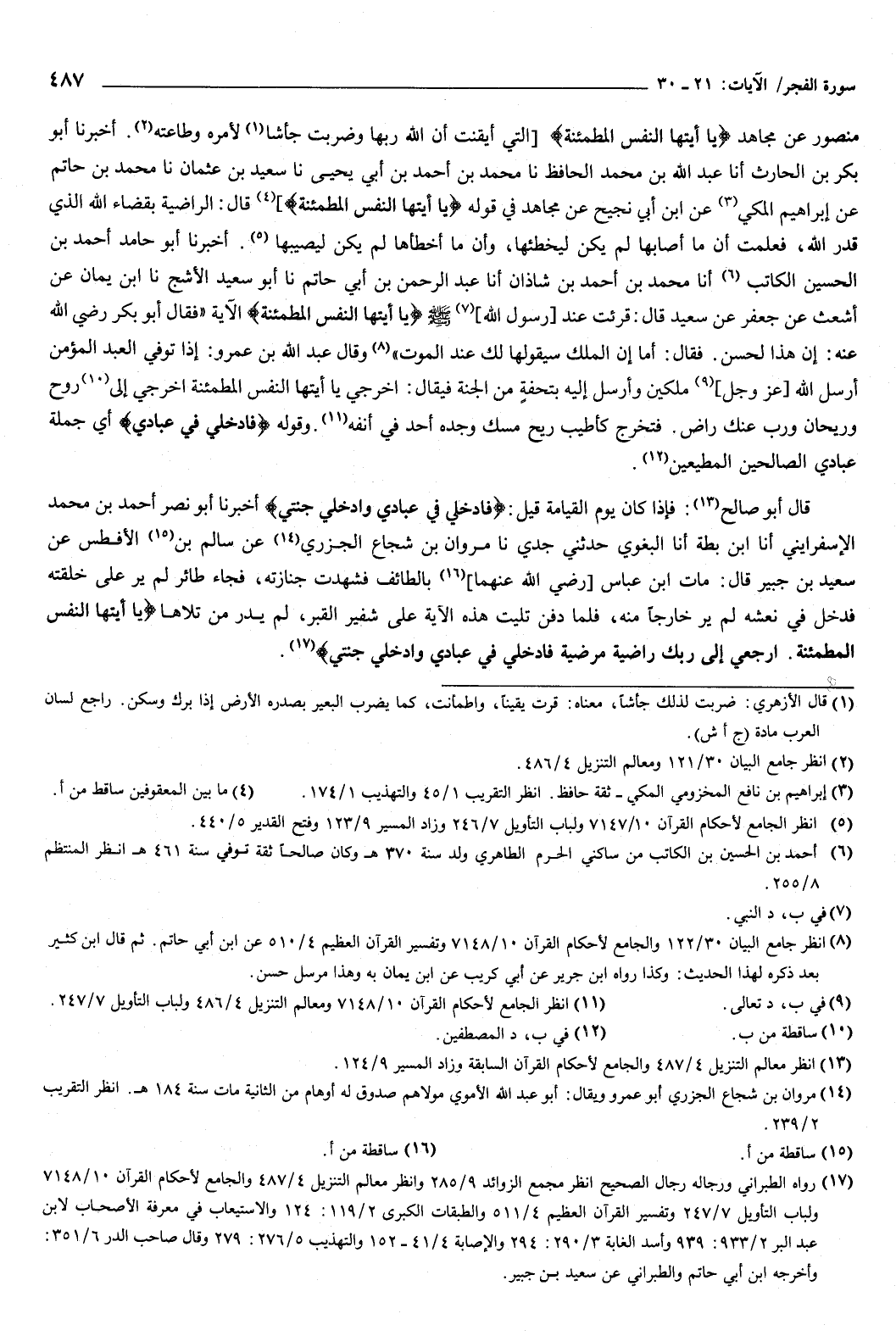 أخبرنا أبو بكر بن الحارث، أنا عبد الله بن محمد الحافظ، نا محمد بن أحمد بن أبي يحيى، نا سعيد بن عثمان، نا محمد بن حاتم، عن إبراهيم المكي، عن ابن أبي نجيح، عن مجاهد في قوله: {يَأَيَّتُهَا النَّفْسُ الْمُطْمَئِنَّةُ} [الفجر: 27] ، قال: الراضية بقضاء الله الذي قدر الله، فعلمت أن ما أصابها لم يكن ليخطئها، وأن ما أخطأها لم يكن ليصيبها.