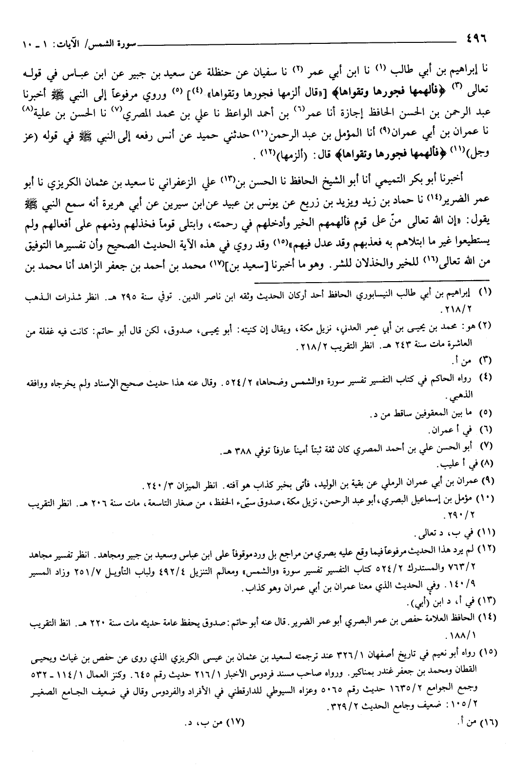نا إِبْرَاهِيمُ بْنُ أَبِي طَالِبٍ، نا ابْنُ أَبِي عُمَرَ، نا سُفْيَانُ، عَنْ حَنْظَلَةَ، عَنْ سَعِيدِ بْنِ جُبَيْرٍ، عَنِ ابْنِ عَبَّاسٍ فِي قَوْلِهِ تَعَالَى: {فَأَلْهَمَهَا فُجُورَهَا وَتَقْوَاهَا} [الشمس: 8] قَالَ: أَلْزَمَهَا فُجُورَهَا وَتَقْوَاهَا، وَرُوِيَ مَرْفُوعًا إِلَى النَّبِيِّ صَلَّى اللهُ عَلَيْهِ وَسَلَّمَ.