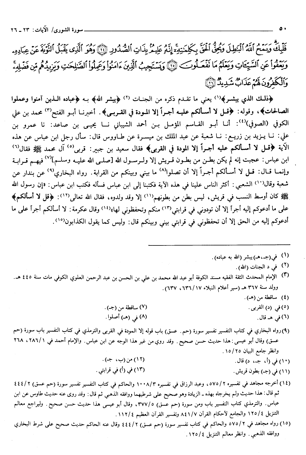 {ذَلِكَ الَّذِي يُبَشِّرُ} [الشورى: 23] يعني: ما تقدم ذكره من الجنات، يبشر الله به، {عِبَادَهُ الَّذِينَ آمَنُوا وَعَمِلُوا الصَّالِحَاتِ} [الشورى: 23] ، وقوله: {قُلْ لا أَسْأَلُكُمْ عَلَيْهِ أَجْرًا إِلا الْمَوَدَّةَ فِي الْقُرْبَى} [الشورى: 23] .