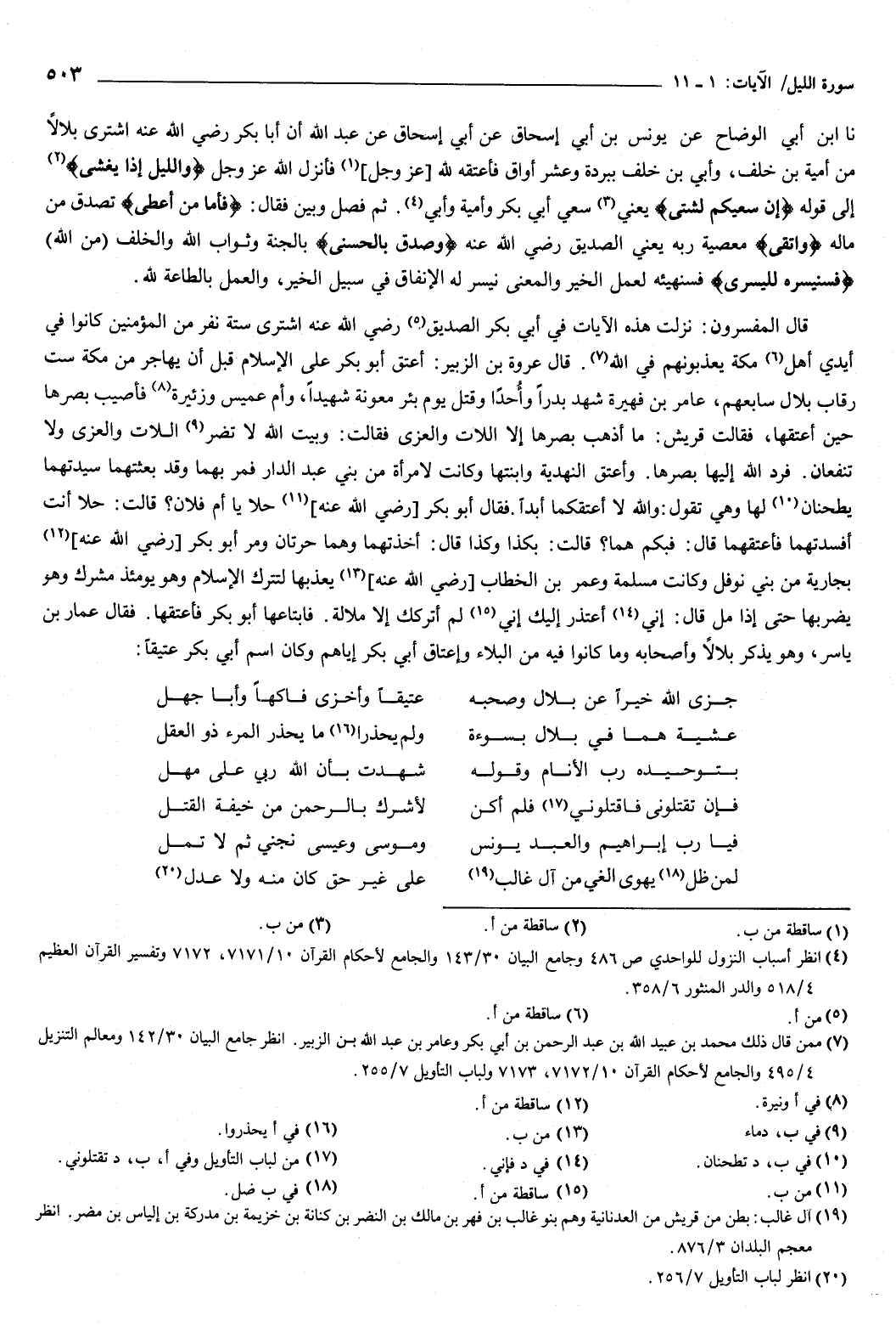 فابتاعها أبو بكر فأعتقها، فقال عمار بن ياسر، وهو يذكر بلالًا وأصحابه وما كانوا فيه من البلاء، وإعتاق أبي بكر إياهم، وكان اسم أبي بكر عتيقًا: