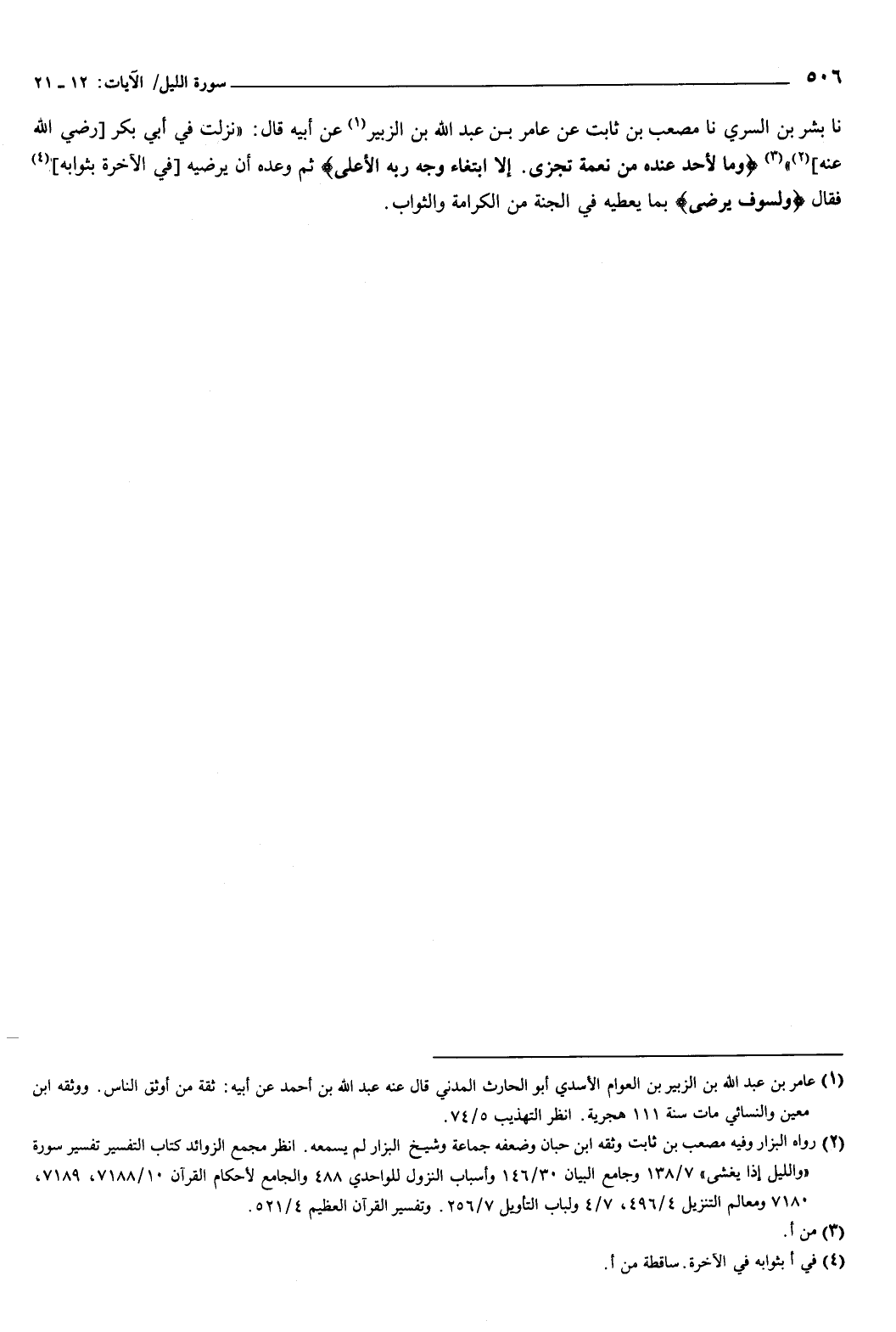 نا بِشْرُ بْنُ السَّرِيِّ، نا مُصْعَبُ بْنُ ثَابِتٍ، عَنْ عَامِرِ بْنِ عَبْدِ اللَّهِ بْنِ الزُّبَيْرِ، عَنْ أَبِيهِ، قَالَ: نَزَلَتْ فِي أَبِي بَكْرٍ رَضِيَ اللَّهُ عَنْهُ {وَمَا لأَحَدٍ عِنْدَهُ مِنْ نِعْمَةٍ تُجْزَى {19} إِلا ابْتِغَاءَ وَجْهِ رَبِّهِ الأَعْلَى {20} } [الليل: 19-20]