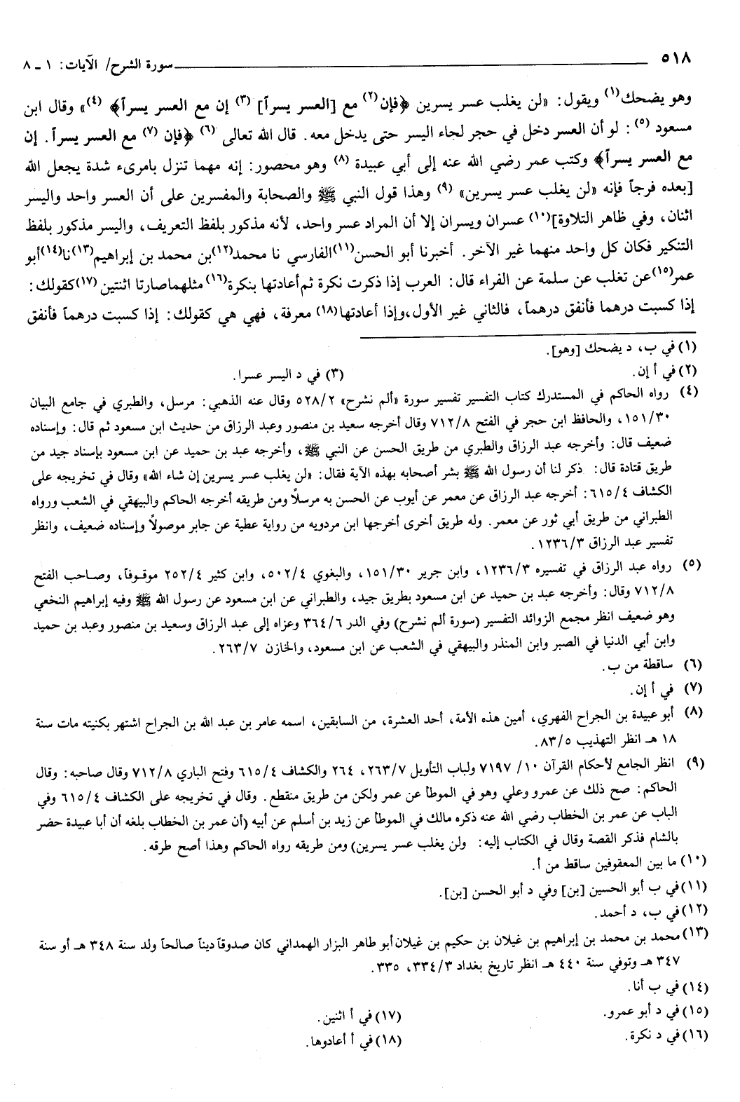 أخبرنا أبو الحسن الفارسي، نا محمد بن محمد بن إبراهيم، نا أبو عمر، عن تغلب، عن سلمة، عن الفراء، قال: العرب إذا ذكرت نكرة ثم أعادتها بنكرة، مثلهما صارتا اثنتين، كقولك: إذا كسبت درهما فأنفق درهمًا.