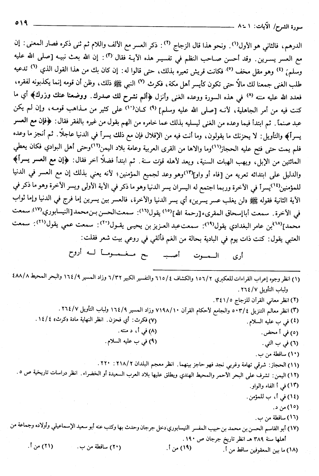 ونحو هذا قال الزجاج: ذكر العسر مع الألف واللام، ثم ثنى ذكره، فصار المعنى: إن مع العسر يسرين.