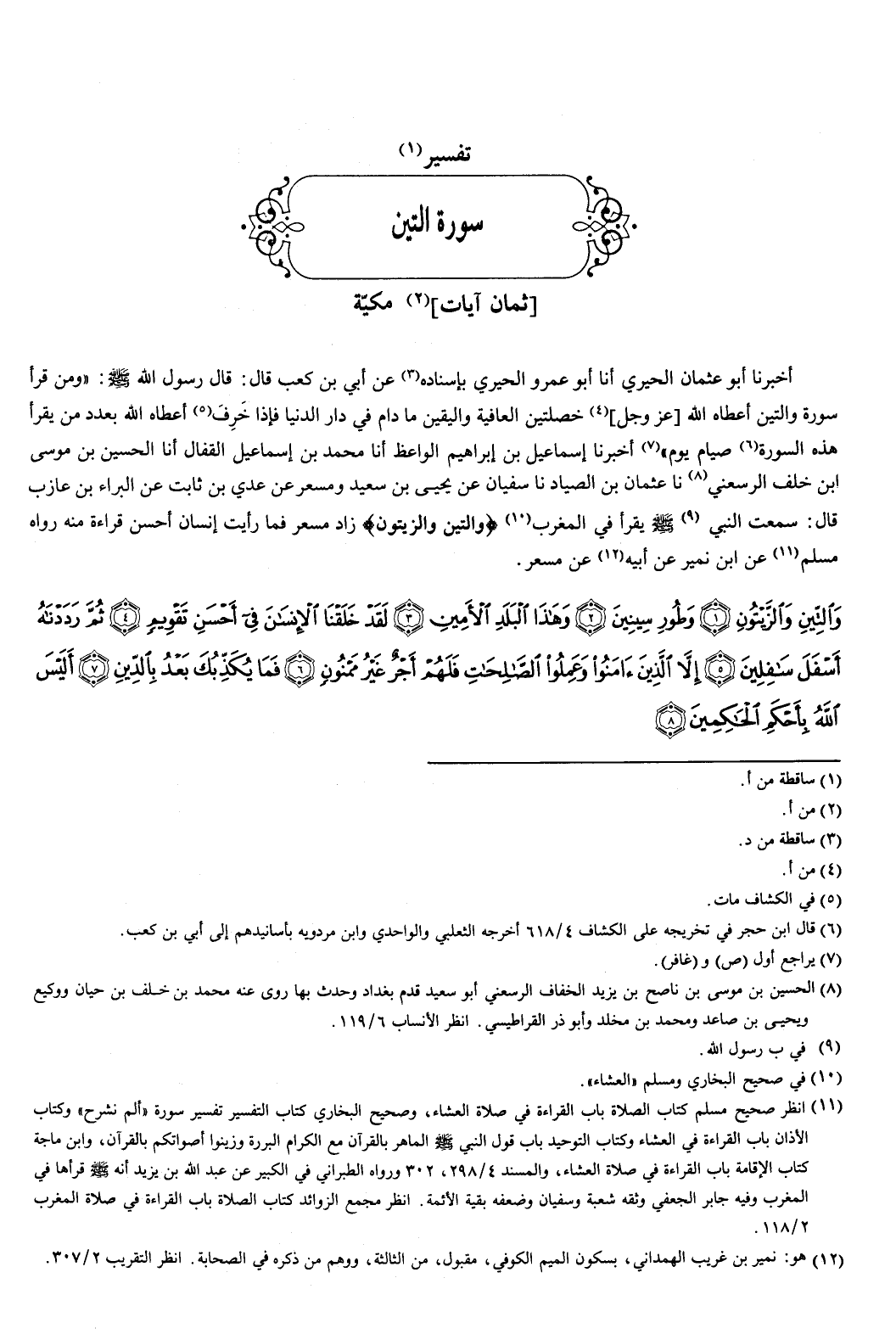 بسم الله الرحمن الرحيم {وَالتِّينِ وَالزَّيْتُونِ {1} وَطُورِ سِينِينَ {2} وَهَذَا الْبَلَدِ الأَمِينِ {3} لَقَدْ خَلَقْنَا الإِنْسَانَ فِي أَحْسَنِ تَقْوِيمٍ {4} ثُمَّ رَدَدْنَاهُ أَسْفَلَ سَافِلِينَ {5} إِلا الَّذِينَ آمَنُوا وَعَمِلُوا الصَّالِحَاتِ فَلَهُمْ أَجْرٌ غَيْرُ مَمْنُونٍ {6} فَمَا يُكَذِّبُكَ بَعْدُ بِالدِّينِ {7} أَلَيْسَ اللَّهُ بِأَحْكَمِ الْحَاكِمِينَ {8} } [التين: 1-8] .