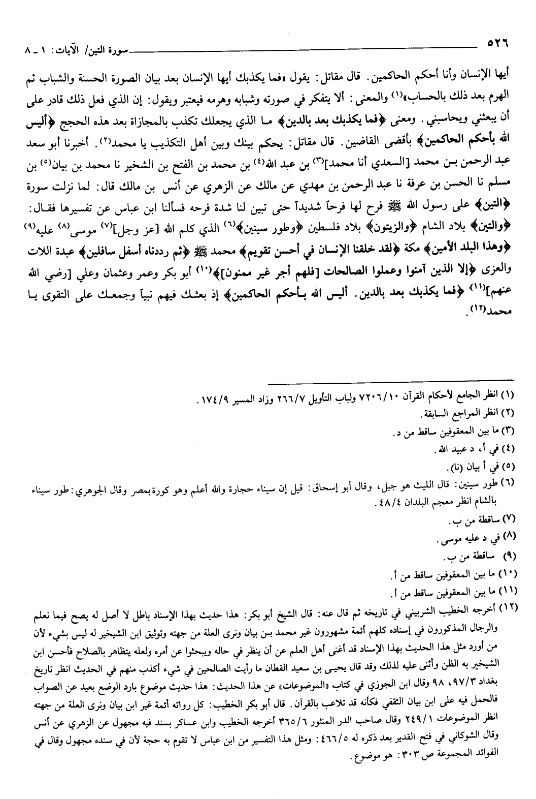 1393 - أَخْبَرَنَا أَبُو سَعْدٍ عَبْدُ الرَّحْمَنِ بْنُ مُحَمَّدٍ السَّعْدِيُّ، أنا مُحَمَّدُ بْنُ عَبْدِ اللَّهِ بْنِ مُحَمَّدِ بْنِ الْفَتْحِ بْنِ الشِّخِّيرِ، نا مُحَمَّدُ بْنُ بَيَانِ بْنِ مُسْلِمٍ، نا الْحَسَنُ بْنُ عَرَفَةَ، نا عَبْدُ الرَّحْمَنِ بْنُ مَهْدِيٍّ، عَنْ مَالِكٍ، عَنِ الزُّهْرِيِّ، عَنْ أَنَسِ بْنِ مَالِكٍ، قَالَ: لَمَّا نَزَلَتْ سُورَةُ التين عَلَى رَسُولِ اللَّهِ صَلَّى اللهُ عَلَيْهِ وَسَلَّمَ فَرِحَ لَهَا فَرَحًا شَدِيدًا حَتَّى تَبَيَّنَ لَنَا شِدَّةُ فَرَحِهِ فَسَأَلْنَا ابْنَ عَبَّاسٍ عَنْ تَفْسِيرِهَا، فَقَالَ: وَالتِّينِ بِلادُ الشَّامِ وَالزَّيْتُونِ بِلادُ فِلَسْطِينَ {وَطُورِ سِينِينَ} [التين: 2] الَّذِي كَلَّمَ اللَّهُ عَزَّ وَجَلَّ مُوسَى عَلَيْهِ {وَهَذَا الْبَلَدِ الأَمِينِ} [التين: 3] مَكَّةُ {لَقَدْ خَلَقْنَا الإِنْسَانَ فِي أَحْسَنِ تَقْوِيمٍ} [التين: 4] مُحَمَّدٌ صَلَّى اللهُ عَلَيْهِ وَسَلَّمَ {ثُمَّ رَدَدْنَاهُ أَسْفَلَ سَافِلِينَ} [التين: 5] عَبَدَةُ الَّلاتِ وَالْعُزَّى {إِلا الَّذِينَ آمَنُوا وَعَمِلُوا الصَّالِحَاتِ فَلَهُمْ أَجْرٌ غَيْرُ مَمْنُونٍ} [التين: 6] أَبُو بَكْرٍ، وَعُمَرُ، وَعُثْمَانُ، وَعَلِيٌّ رَضِيَ اللَّهُ عَنْهُمْ {فَمَا يُكَذِّبُكَ بَعْدُ بِالدِّينِ {7} أَلَيْسَ اللَّهُ بِأَحْكَمِ الْحَاكِمِينَ {8} } [التين: 7-8] إِذْ بَعَثَكَ فِيهِمْ نَبِيًّا وَجَمَعَكَ عَلَى التَّقْوَى يَا مُحَمَّدُ.