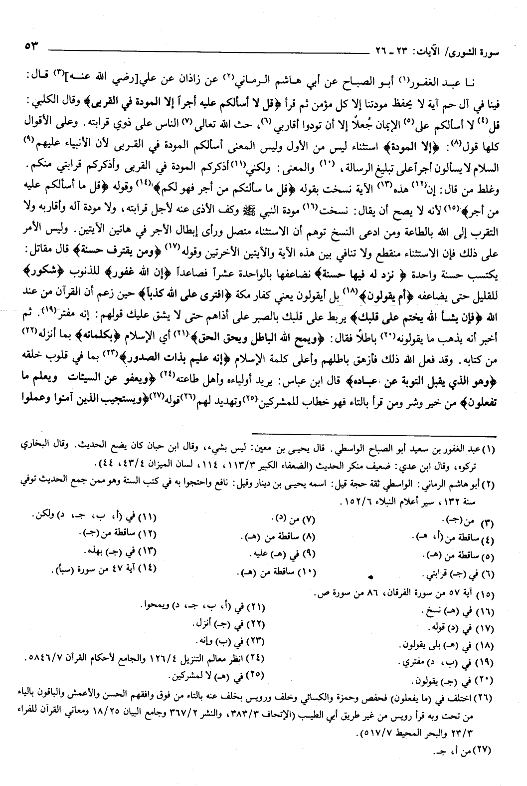 نا عَبْدُ الْغَفُورِ أَبُو الصَّبَّاحِ، عَنْ أَبِي هَاشِمٍ الرَّمَانِيِّ، عَنْ زَاذَانَ، عَنْ عَلِيٍّ رَضِيَ اللَّهُ عَنْهُ، قَالَ: فِينَا فِي آلِ حم آيَةٌ لا يَحْفَظُ مَوَدَّتَنَا إِلا كُلُّ مُؤْمِنٍ، ثُمَّ قَرَأَ: {قُلْ لا أَسْأَلُكُمْ عَلَيْهِ أَجْرًا إِلا الْمَوَدَّةَ فِي الْقُرْبَى} [الشورى: 23]
