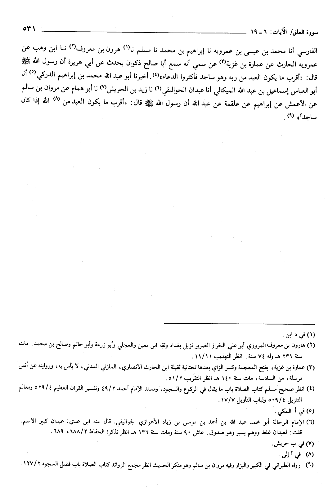 1401 - أَخْبَرَنَا أَبُو عَبْدِ اللَّهِ مُحَمَّدُ بْنُ إِبْرَاهِيمَ الدُّرَّكِيُّ، أنا أَبُو الْعَبَّاسِ إِسْمَاعِيلُ بْنُ عَبْدِ اللَّهِ الْمِيكَالِيُّ، أنا عَبْدَانُ الْجَوَالِيقِيُّ، نا زَيْدُ بْنُ الْحَرِيشِ، نا أَبُو هَمَّامٍ، عَنْ مَرْوَانَ بْنِ سَالِمٍ، عَنِ الأَعْمَشِ، عَنْ إِبْرَاهِيمَ، عَنْ عَلْقَمَةَ، عَنْ عَبْدِ اللَّهِ، أَنَّ رَسُولَ اللَّهِ صَلَّى اللهُ عَلَيْهِ وَسَلَّمَ، قَالَ: «أَقْرَبُ مَا يَكُونُ الْعَبْدُ مِنَ اللَّهِ إِذَا كَانَ سَاجِدًا» .