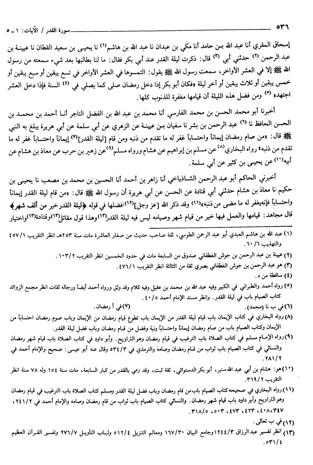 إِسْحَاقَ الْمُقْرِي، أنا عَبْدُ اللَّهِ بْنُ حَامِدٍ، أنا مَكِّيُّ بْنُ عَبْدَانَ، نا عَبْدُ اللَّهِ بْنُ هَاشِمٍ، نا يَحْيَى بْنُ سَعِيدٍ الْقَطَّانُ، نا عُيَيْنَةُ بْنُ عَبْدِ الرَّحْمَنِ، حَدَّثَنِي أَبِي، قَالَ: ذَكَرْتُ لَيْلَةَ الْقَدْرِ عِنْدَ أَبِي بَكْرَةَ، فَقَالَ: مَا أَنَا بِطَالِبِهَا بَعْدَ شَيْءٍ سَمِعْتُهُ مِنْ رَسُولِ اللَّهِ صَلَّى اللهُ عَلَيْهِ وَسَلَّمَ إِلا فِي الْعَشْرِ الأَوَاخِرِ، سَمِعْتُ رَسُولَ اللَّهِ صَلَّى اللهُ عَلَيْهِ وَسَلَّمَ يَقُولُ: «الْتَمِسُوهَا فِي الْعَشْرِ الأَوَاخِرِ فِي تِسْعٍ يَبْقَيْنَ أَوْ سَبْعٍ يَبْقَيْنَ أَوْ خَمْسٍ يَبْقَيْنَ أَوْ ثَلاثٍ يَبْقَيْنَ أَوْ آخِرِ لَيْلَةٍ» فَكَانَ أَبُو بَكْرَةَ إِذَا دَخَلَ رَمَضَانُ صَلَّى كَمَا يُصَلِّي فِي السَّنَةِ، فَإِذَا دَخَلَ الْعَشْرُ اجْتَهَدَ، وَمِنْ فَضْلِ هَذِهِ اللَّيْلَةِ أَنَّ قِيَامَهَا مَغْفِرَةٌ لِلذُّنُوبِ كُلِّهَا.